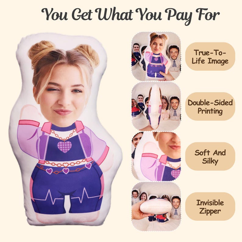 Came in and it doesn't look like the pictures, it has a large white outline around the outside of my cat and it doesn't look dumb and funny, it just looks like a regular pillow with a cat picture pasted on it. The quality is nice though and has yet to sustain any damages after 3 months.