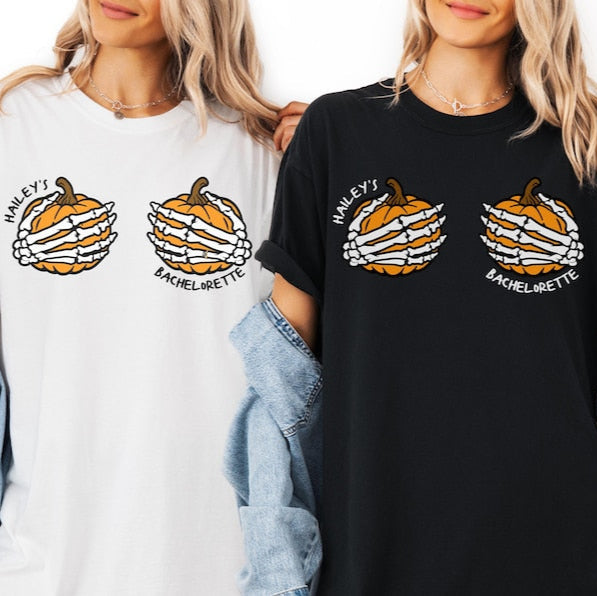 Custom Halloween Bachelorette Shirts, Skeleton Pumpkin Funny Bridal Party Shirt, Personalized Spooky Bride Gothic Wedding, Bride Boo Crew