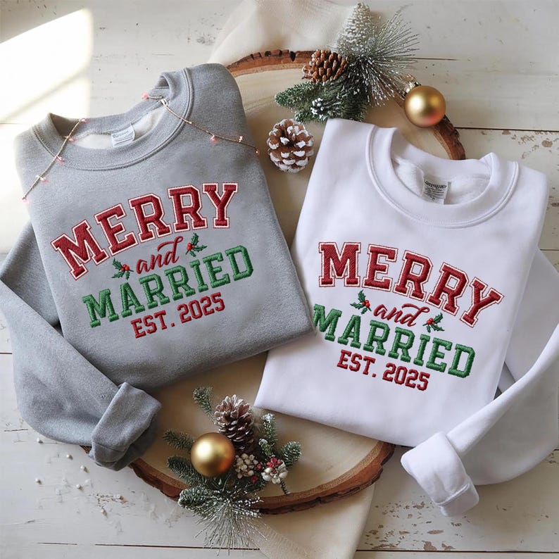 Embroidered Merry and Married Sweatshirt, Christmas Newlywed Couple Sweater, Matching Holiday Honeymoon Crewneck, Married Est 2025 Shirt