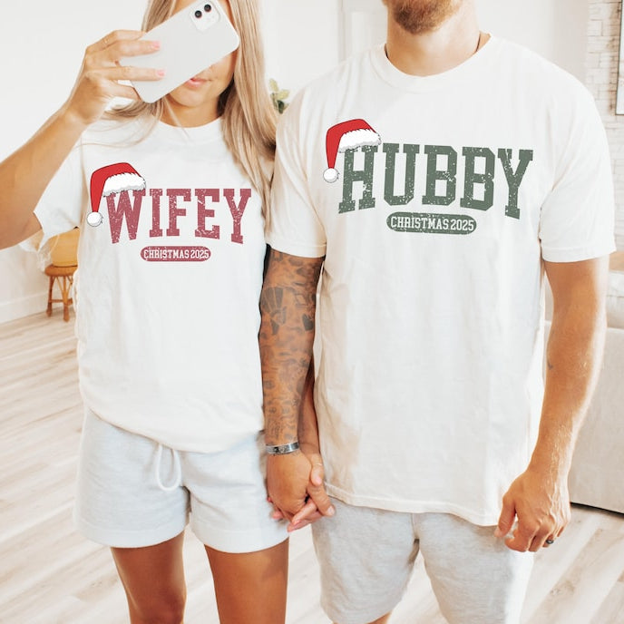 Wifey Hubby Shirt, Matching Christmas Couple Tee, Married Holiday Gift, First Xmas Shirt, Mr And Mrs Santa Hat Shirt