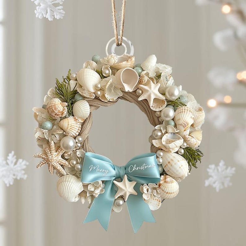 Coastal Christmas wreath 2D Ornament, Aqua Crushed Glass, Shells, Starfish, Beachy Xmas Keepsake, Crushed Shells Holiday Decoration