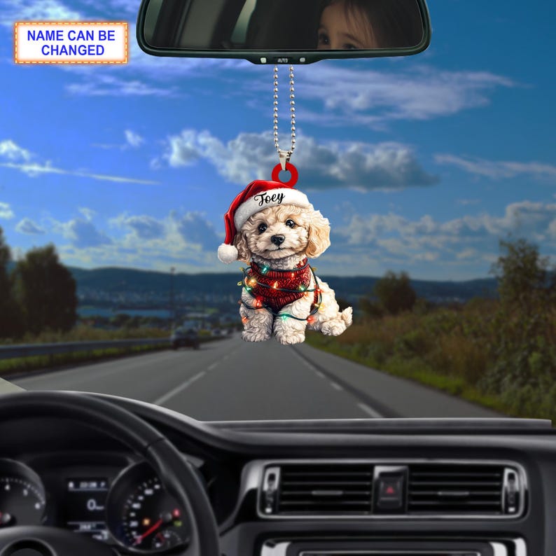 Custom Name Cute Sitting Poodle Dog with Santa Hat Christmas Lights Ornament, Christmas Tree Hanging Decor, Christmas Flat 2D Ornament