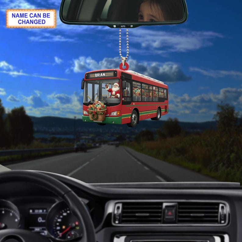 Custom Name Santa Drives Bus Personalized Ornament, Christmas Tree Hanging Decor, 2D Flat Acrylic Christmas Ornament Holiday Gift Magic