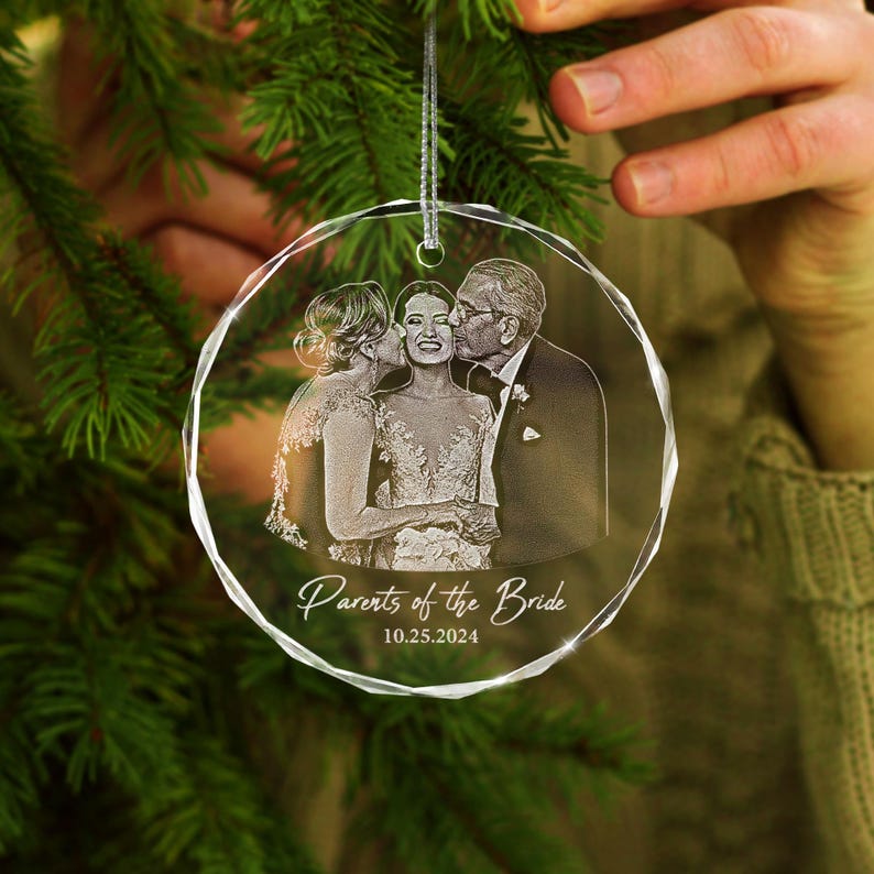 Give a heartfelt and unique gift to the parents of the bride with our Custom Engraved Photo Wedding Ornament. Perfect for Christmas or as a special wedding gift, this ornament features a personalized photo and message for Mom and Dad to cherish.