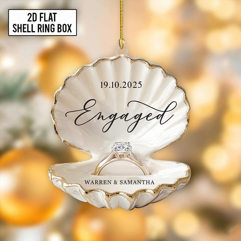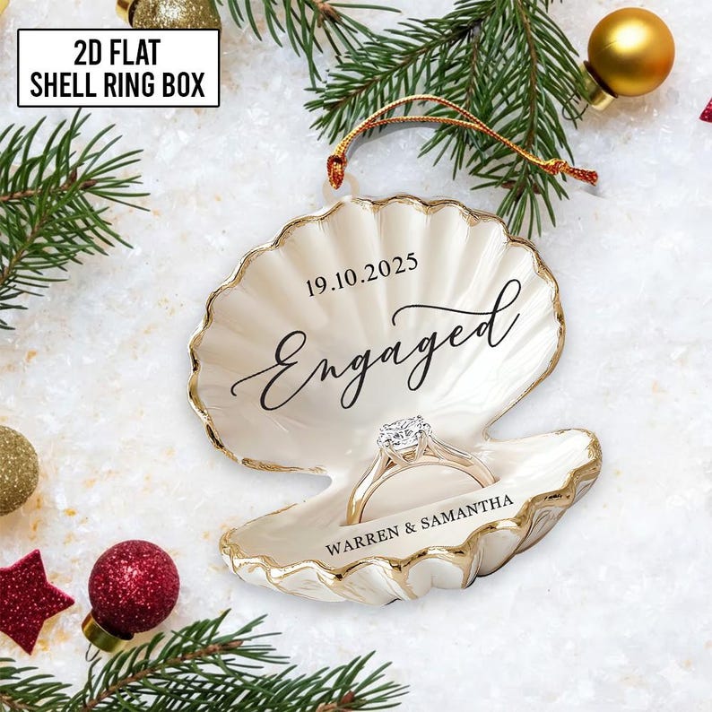 Personalized Beach Engagement Ornament, 2D Flat Shell Ring Box, Wedding 2025 Keepsake, Couple Gift Xmas, Engagement First Xmas Decor