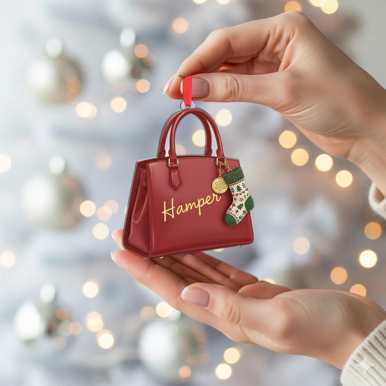 Personalized Handbag Ornament, Custom Name Christmas Tree Decoration with Red Purse and Stocking