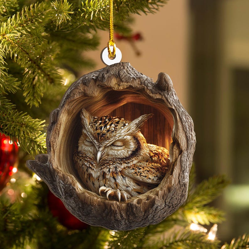 Sleeping Owl Christmas 2D Flat Wood Ornament Peaceful Woodland Bird Ash Plywood Decor | Cute Holiday Tree Gift for Owl & Nature Lovers
