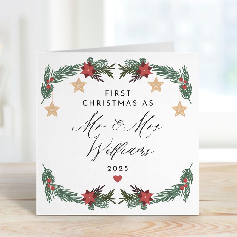 First Christmas as Mr & Mrs Card for Newlywed Couple Wife Husband Xmas Card with Wreath Design Keepsake