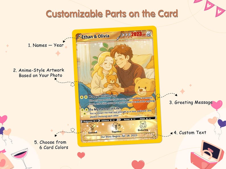 Celebrate your special day with this one of a kind Custom Poke Card . We will take your picture and turn it into an anime inspired art card.