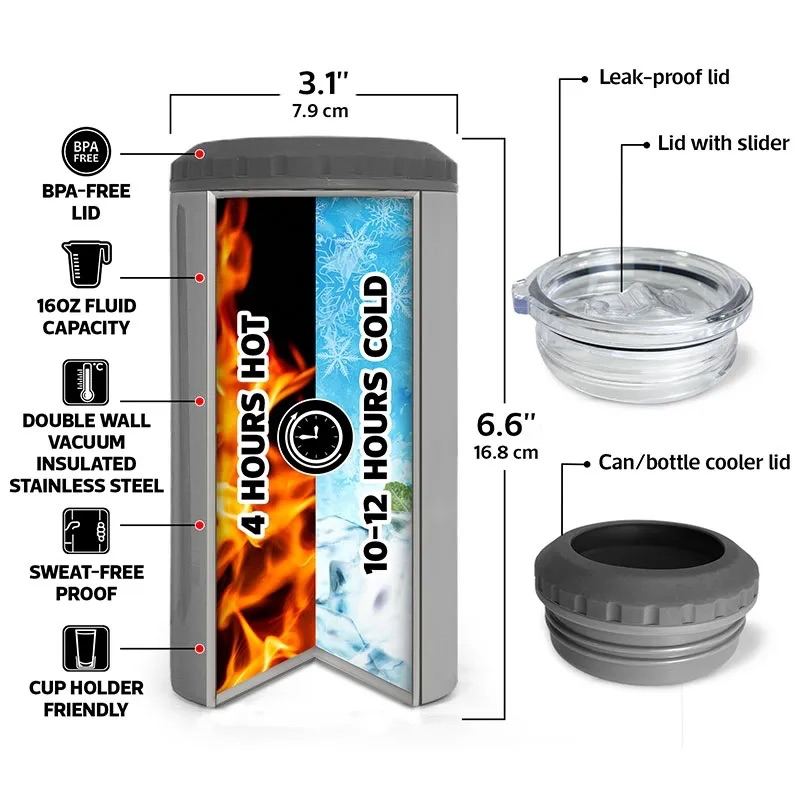 This 4-in-1, 16oz can cooler / tumbler is the Swiss army knife of drinkware. Versatile and ready to take on any beverage! It can hold one 12 oz. slim can, one 12 oz. standard can, or one 12 oz. glass bottle. With a handy acrylic lid, it can even be used as a 16 oz. tumbler by pouring a beverage directly into the cup. Made from double-wall stainless steel, it keeps contents hot or cold for those long road trips. Eye catching, hi-def, vibrant edge-to-edge printing is sure to last.