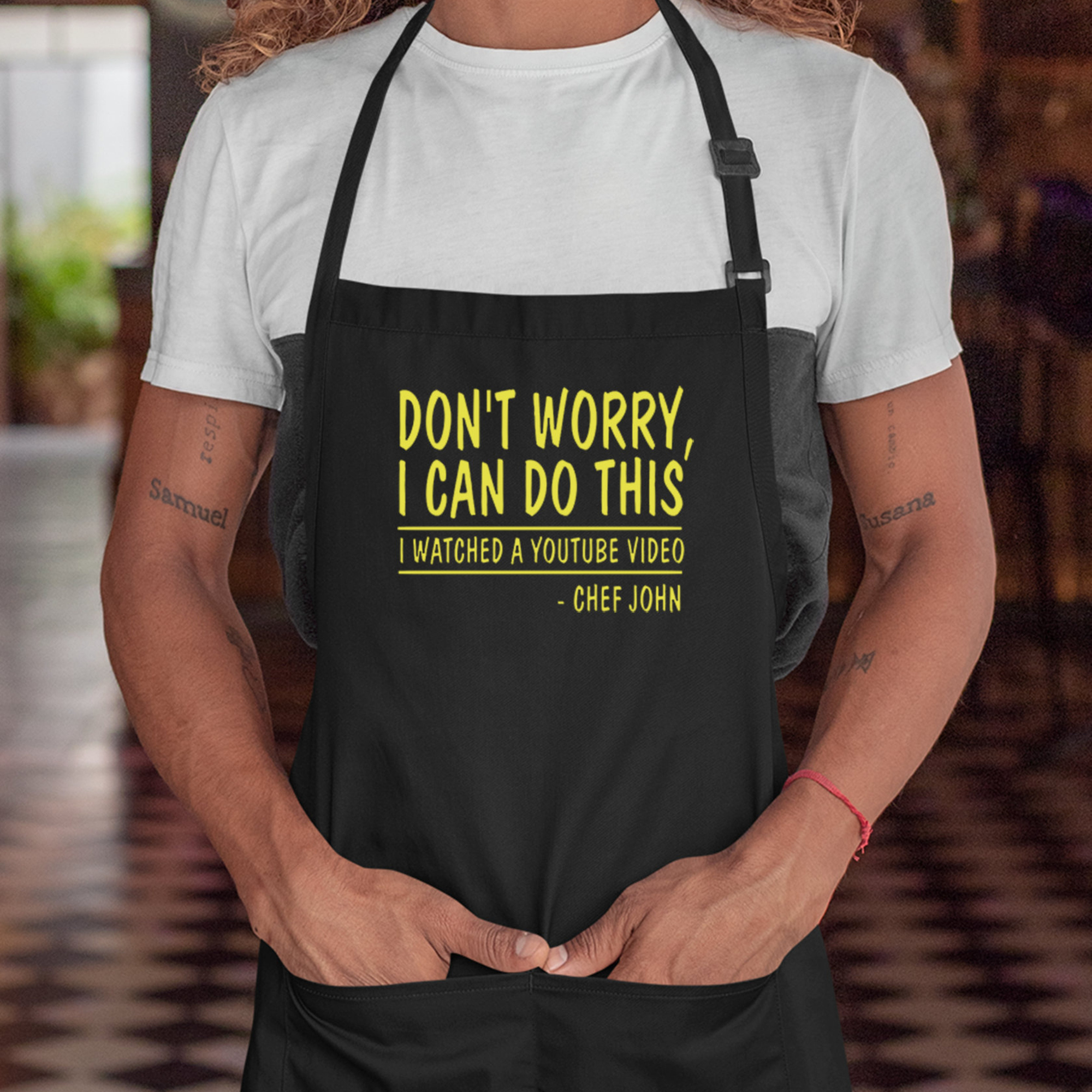-Adult Aprons Feature: 36 inch long ties; Pockets; adjustable neck strap