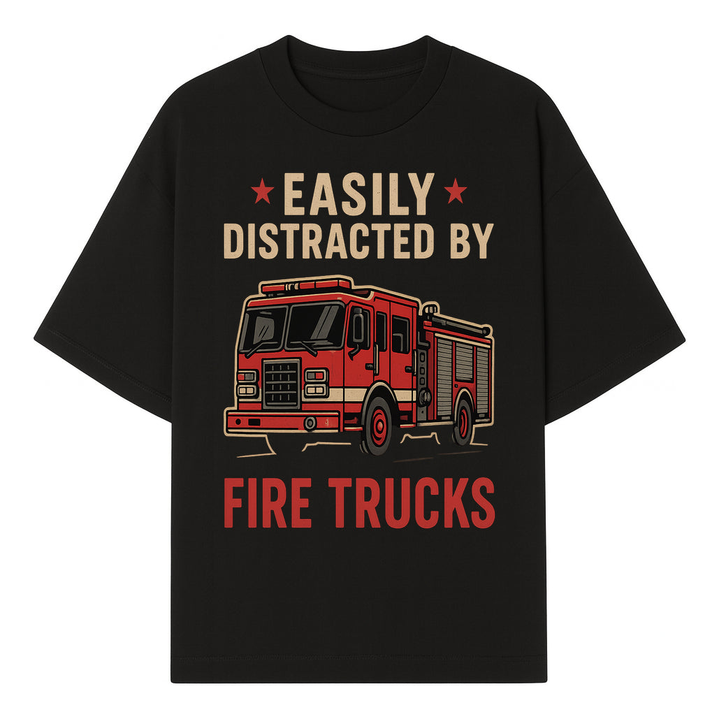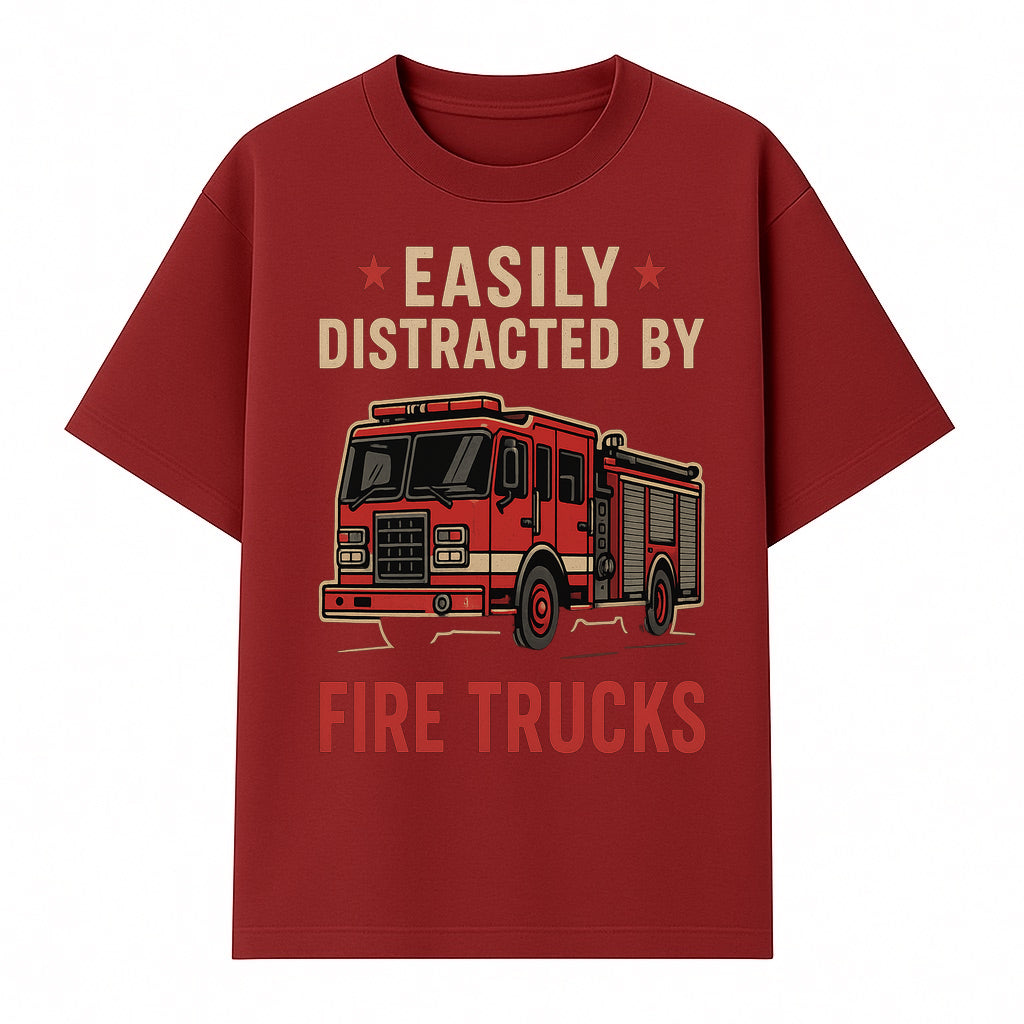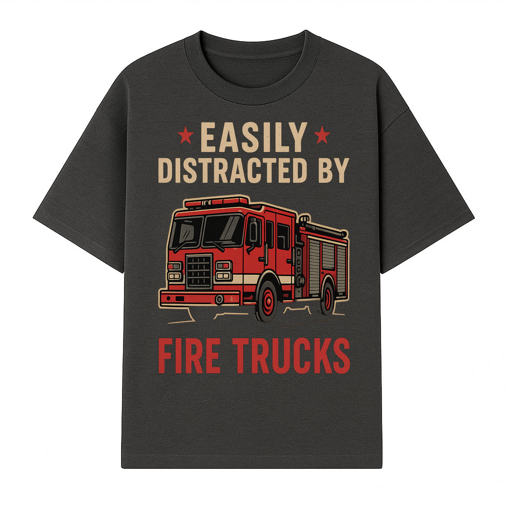 Easily Distracted by Fire Trucks Retro Graphic Tee | Firefighter Enthusiast Shirt | Fun Casual Wear - T-shirt