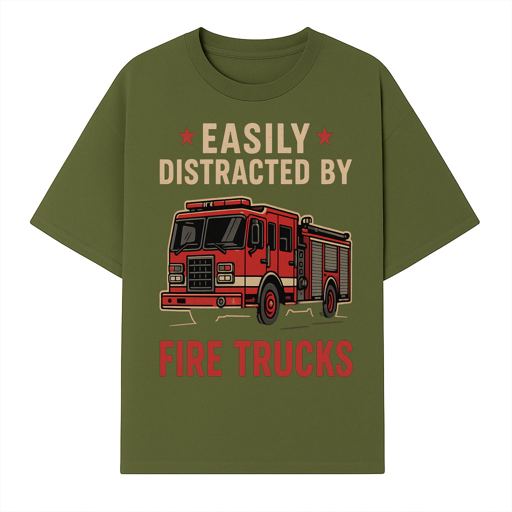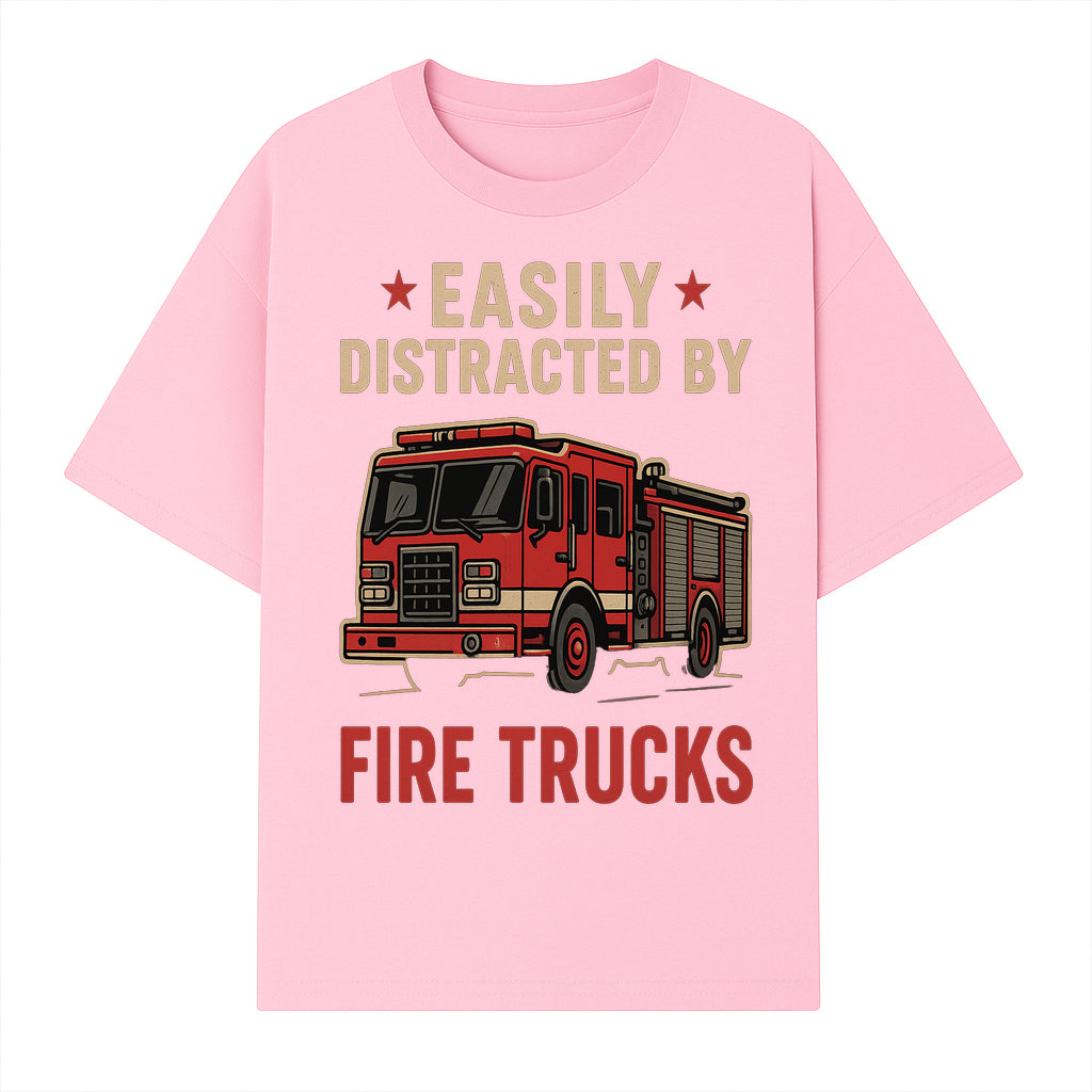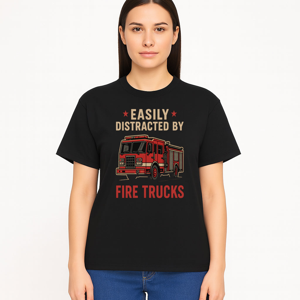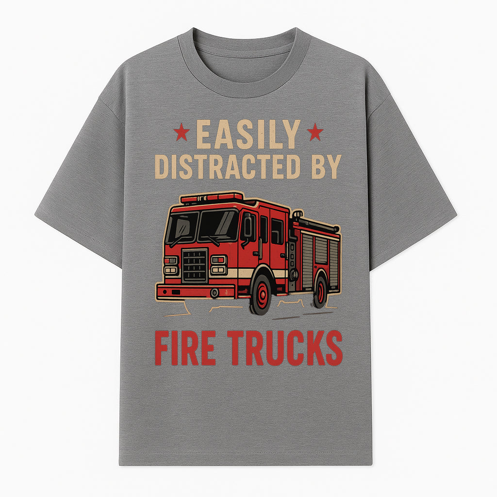 Easily Distracted by Fire Trucks Retro Graphic Tee | Firefighter Enthusiast Shirt | Fun Casual Wear - T-shirt