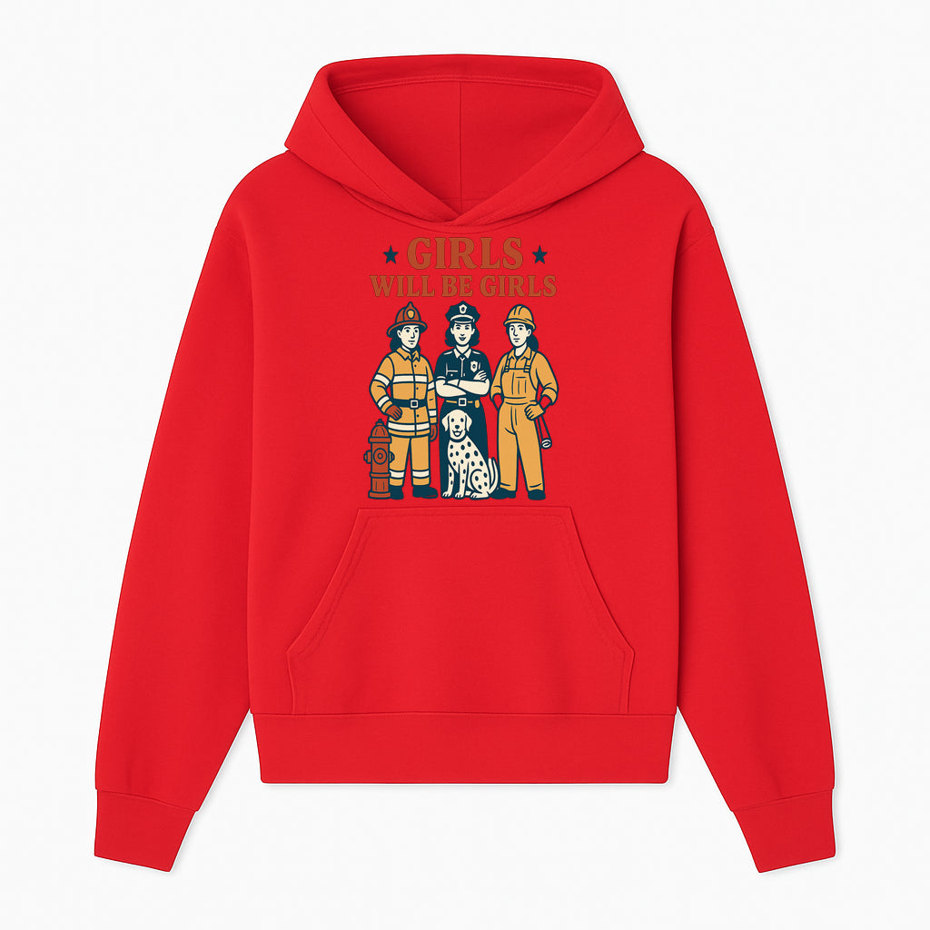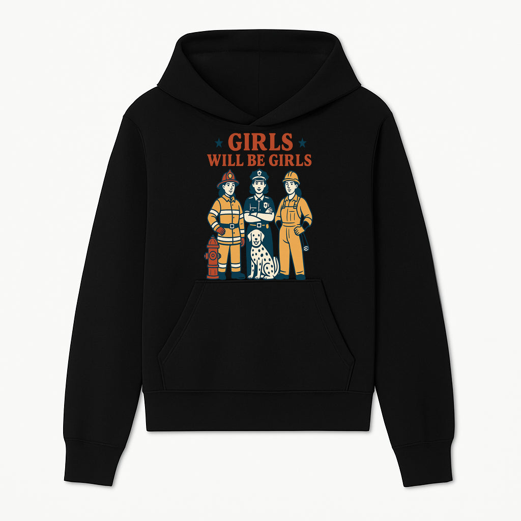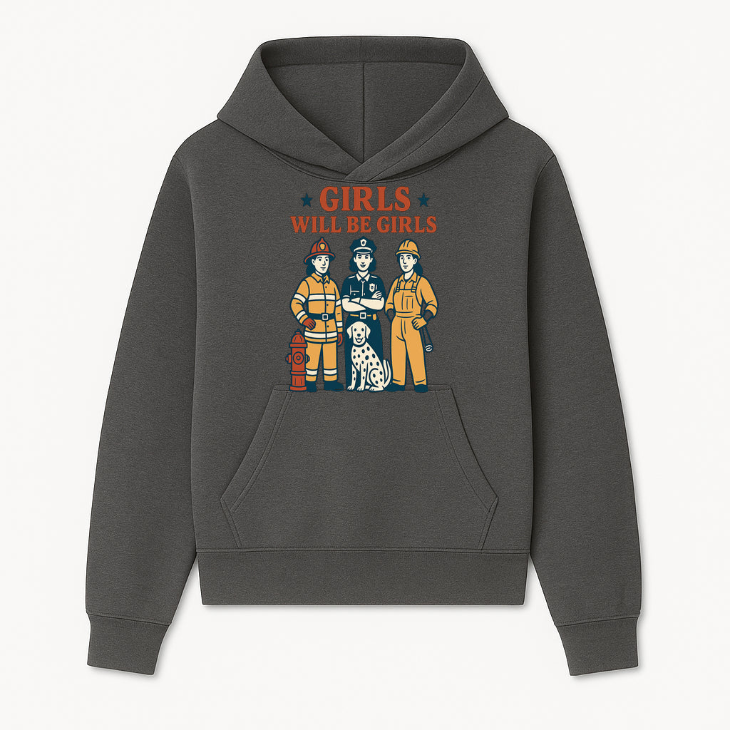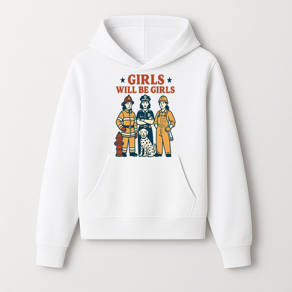 Empowering Girls Art Print - Girls Will Be Girls with Firefighter, Police Officer, Construction Worker & Dog Illustration - Hoodie