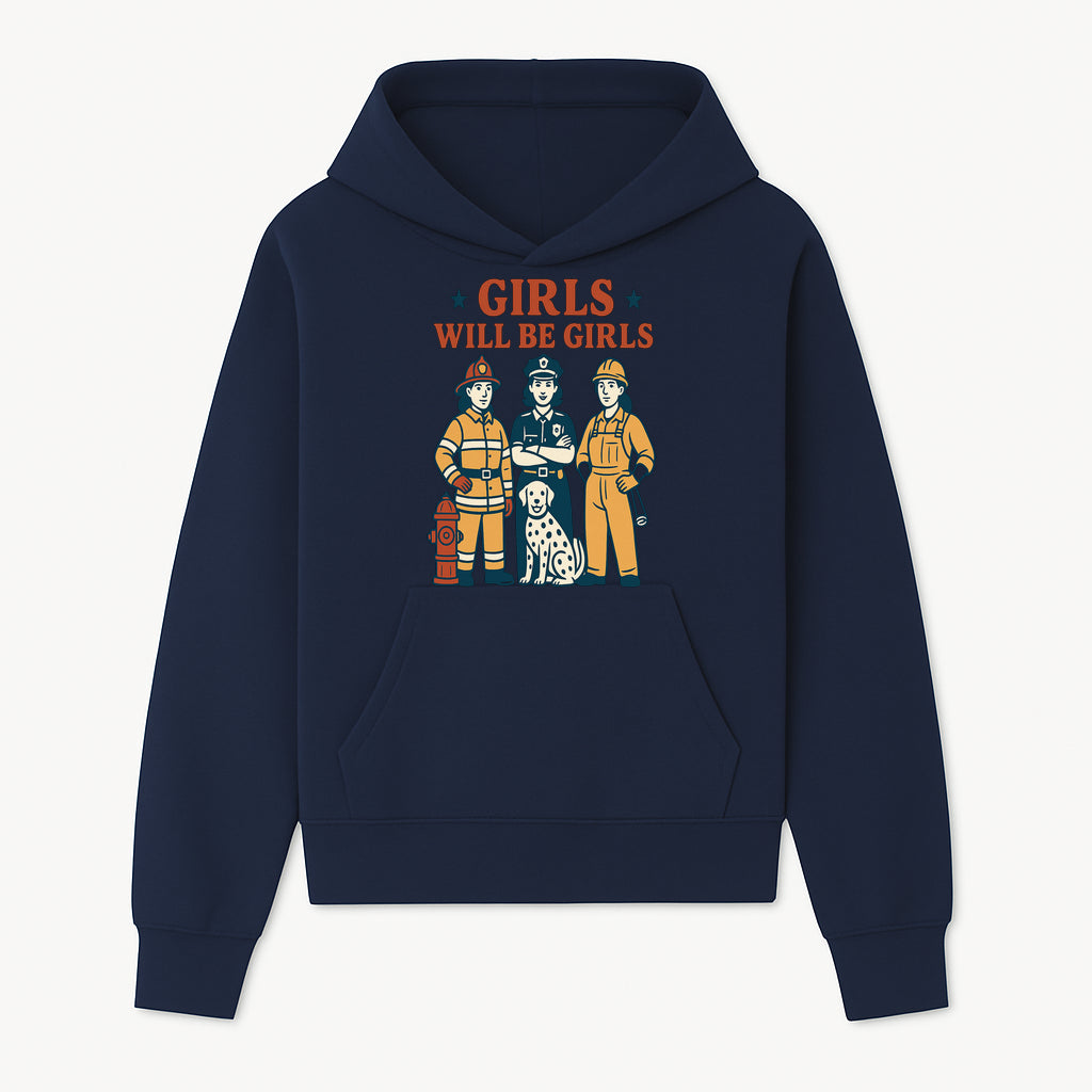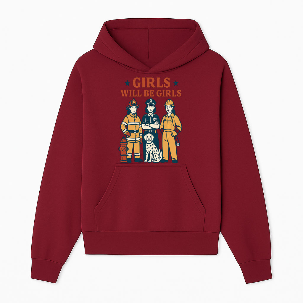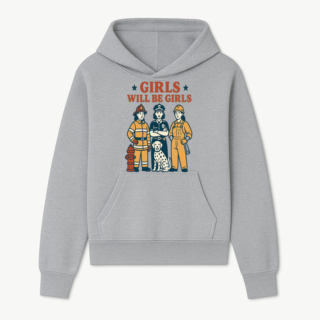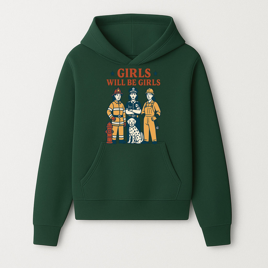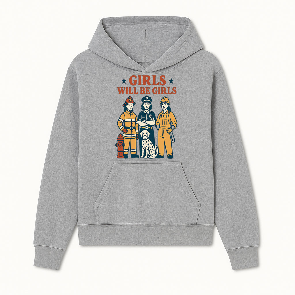 Empowering Girls Art Print - Girls Will Be Girls with Firefighter, Police Officer, Construction Worker & Dog Illustration - Hoodie