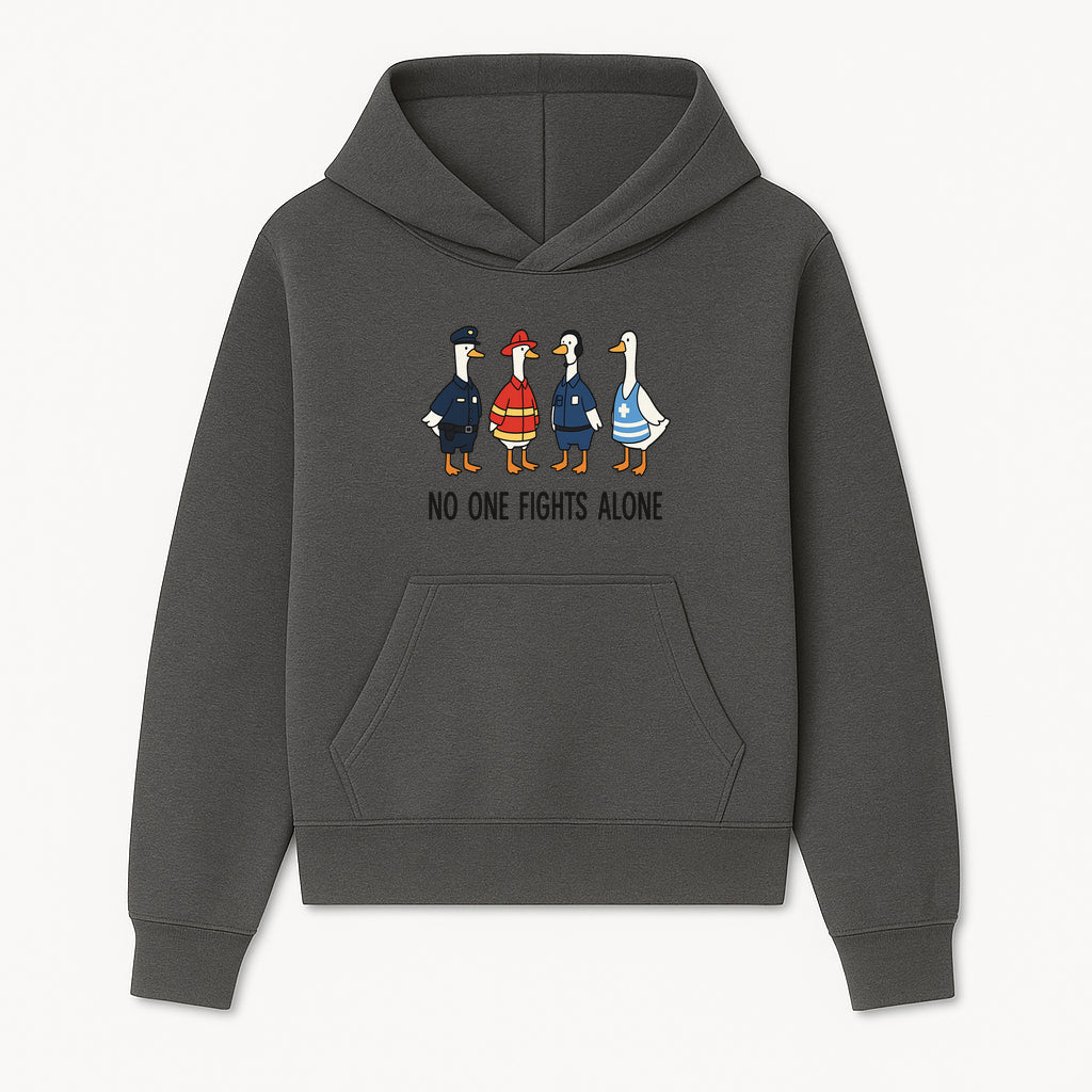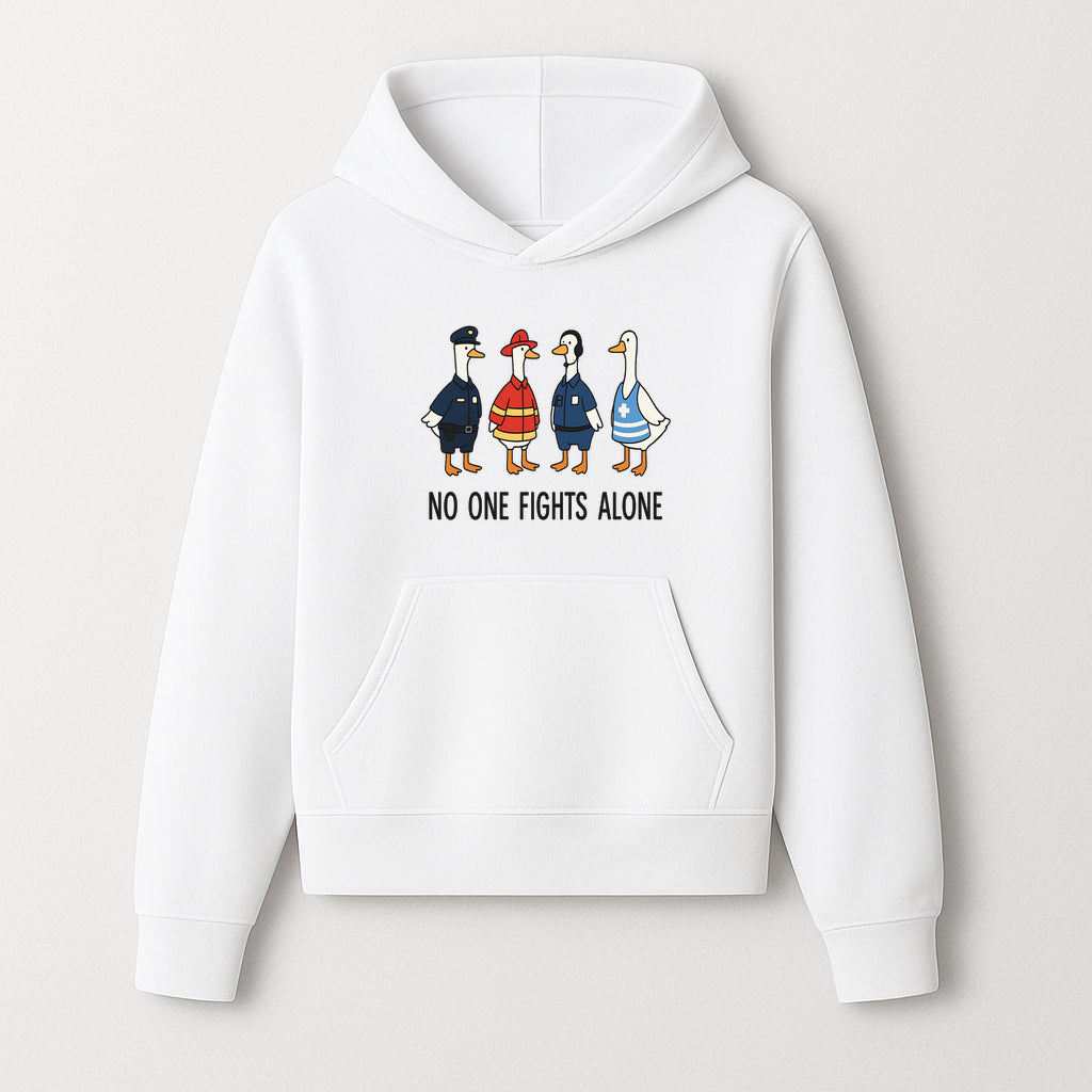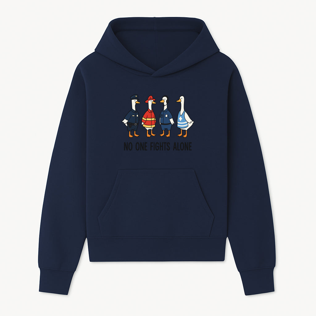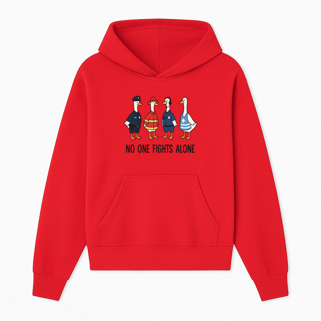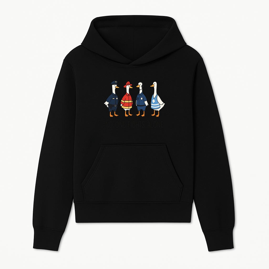 Funny Duck Designs: No One Fights Alone Cop, Firefighter, EMT & Dispatcher Ducks Graphic Tees for Supportive Humor - Hoodie