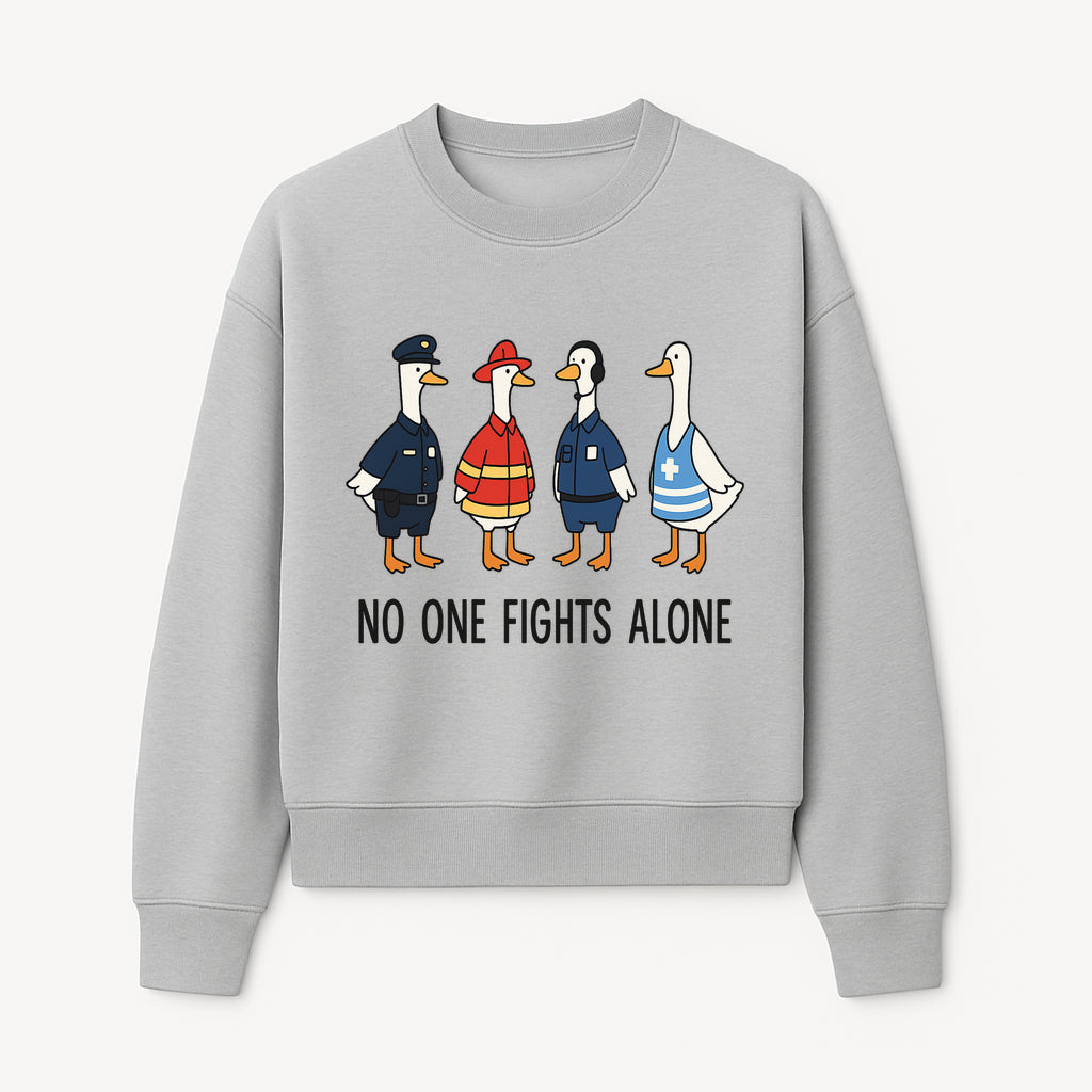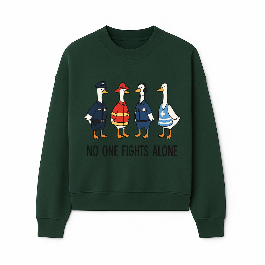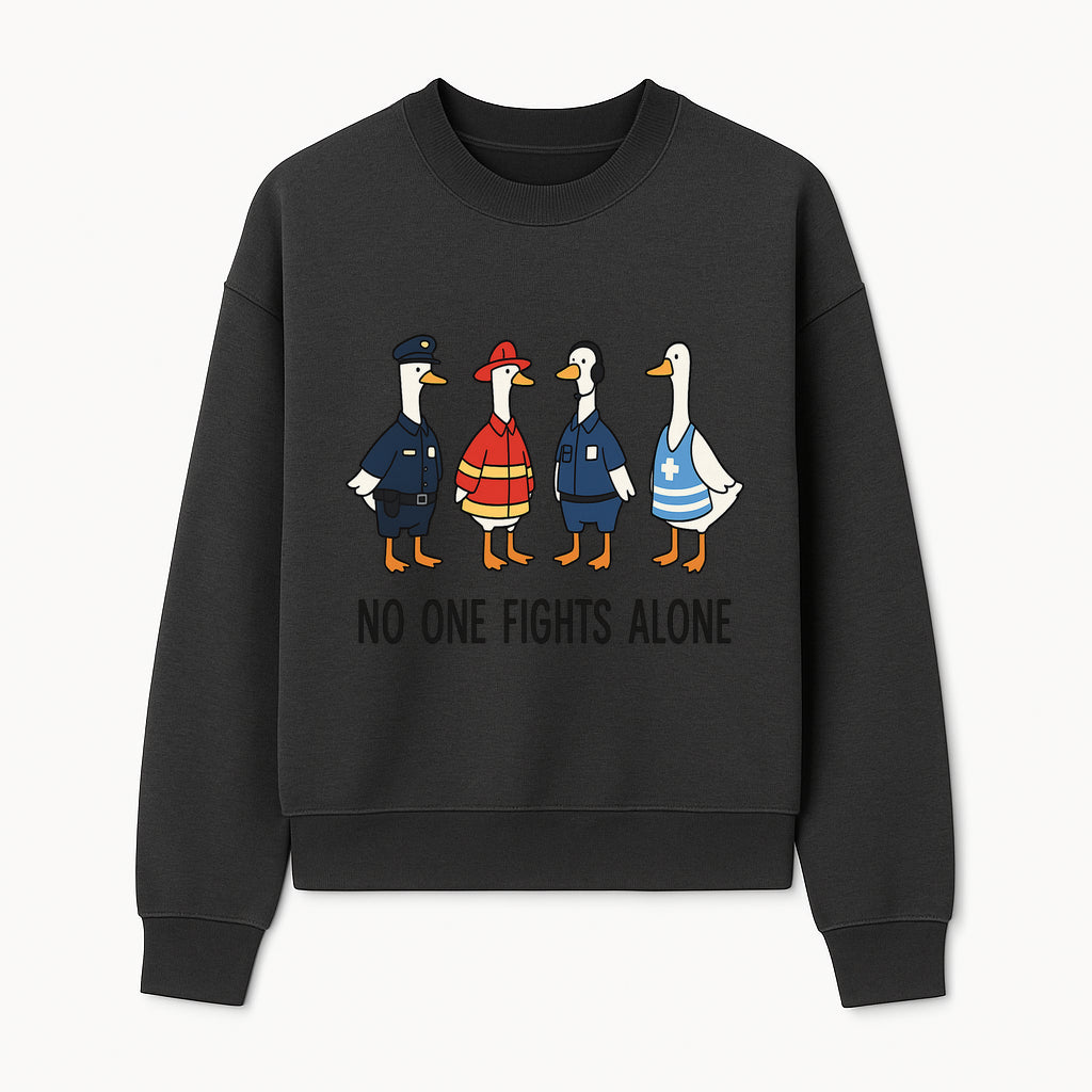 Funny Duck Designs: No One Fights Alone Cop, Firefighter, EMT & Dispatcher Ducks Graphic Tees for Supportive Humor - Sweatshirt