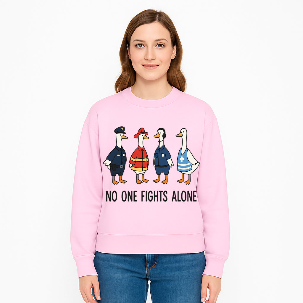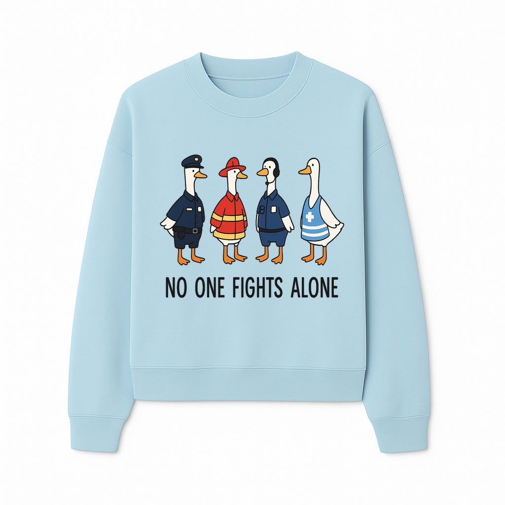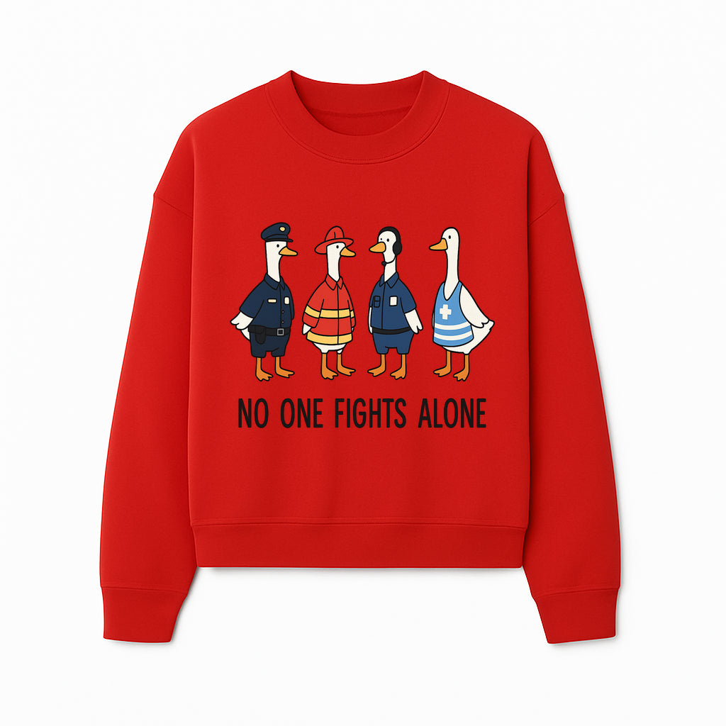 Funny Duck Designs: No One Fights Alone Cop, Firefighter, EMT & Dispatcher Ducks Graphic Tees for Supportive Humor - Sweatshirt