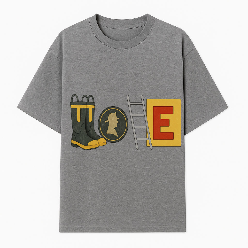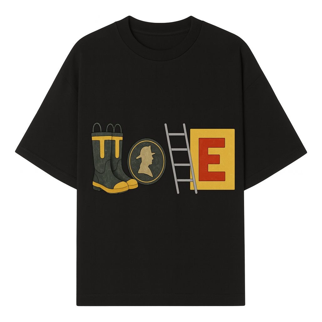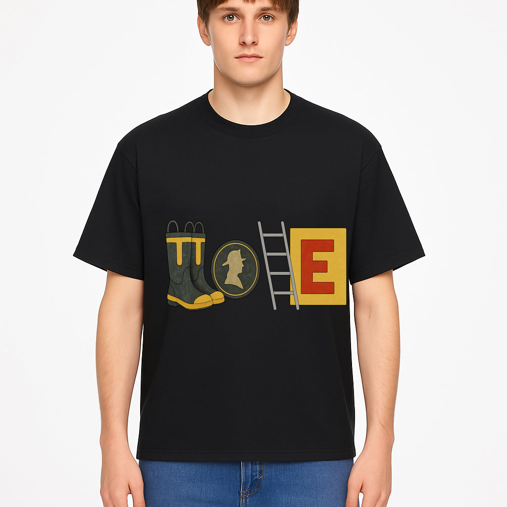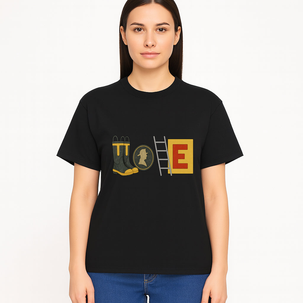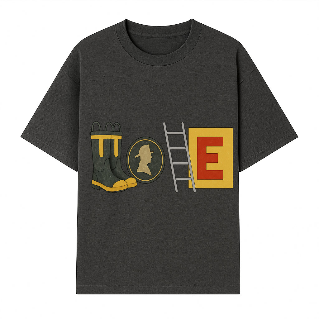 Kids' Detective-Themed Rain Boots with Ladder Icon and E Block - Fun, Stylish, Waterproof Footwear for Adventurous Play - T-shirt