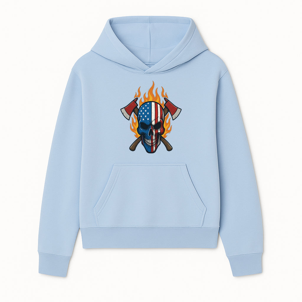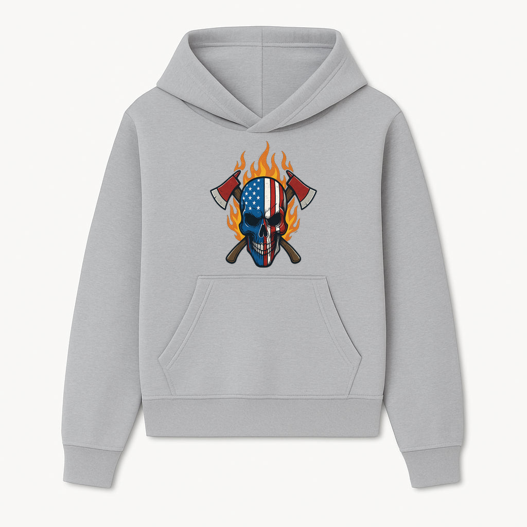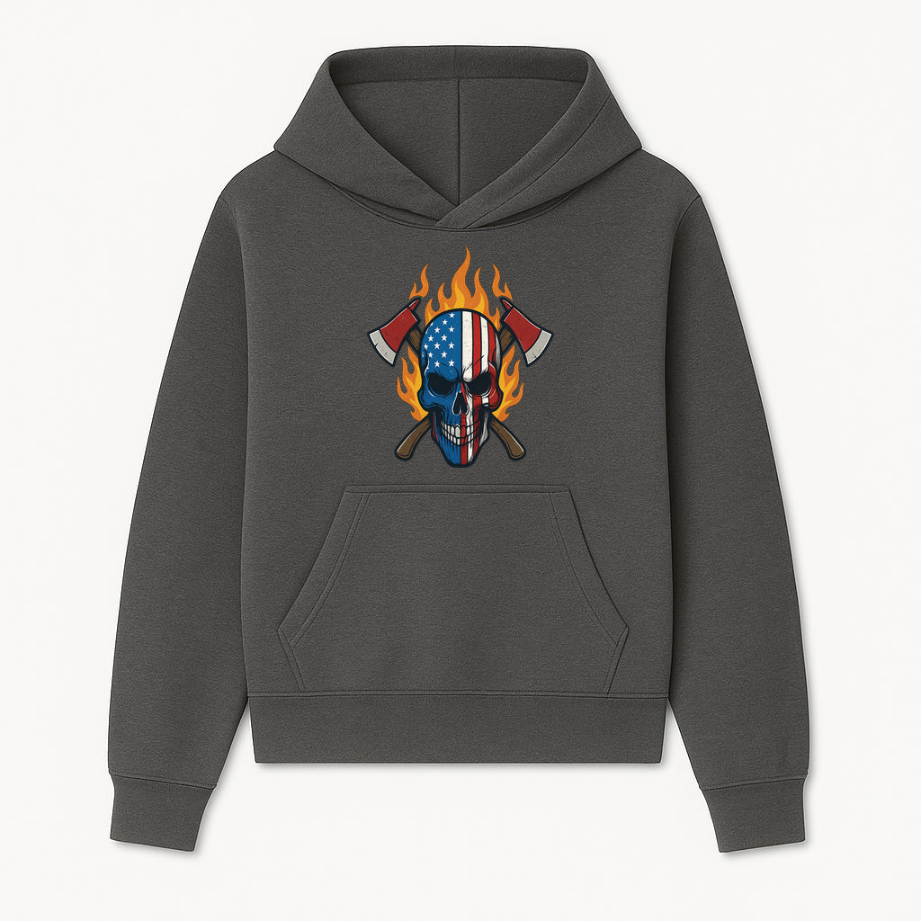 American Skull with Axes and Flames Graphic Tee, Patriotic Skull Design for Men, Edgy Firefighter T-Shirt, Unique Apparel Gift - Hoodie