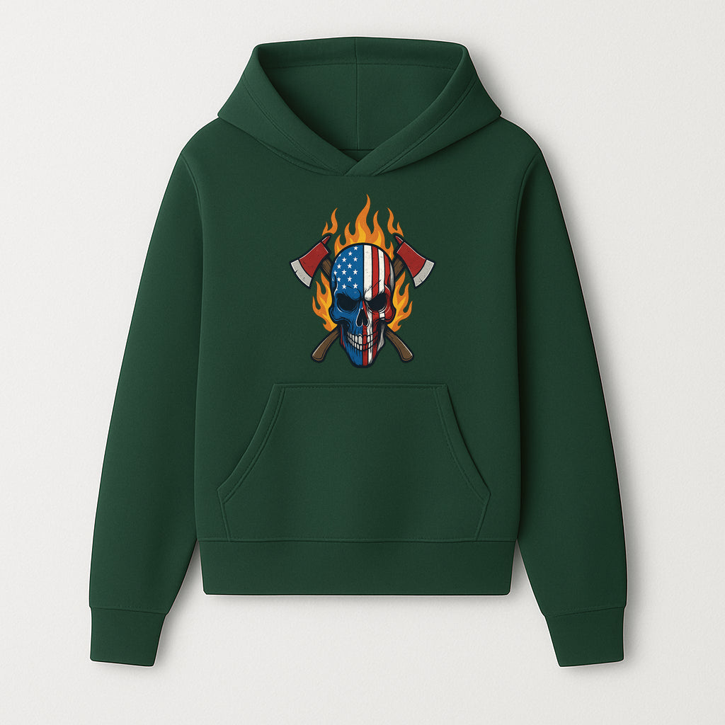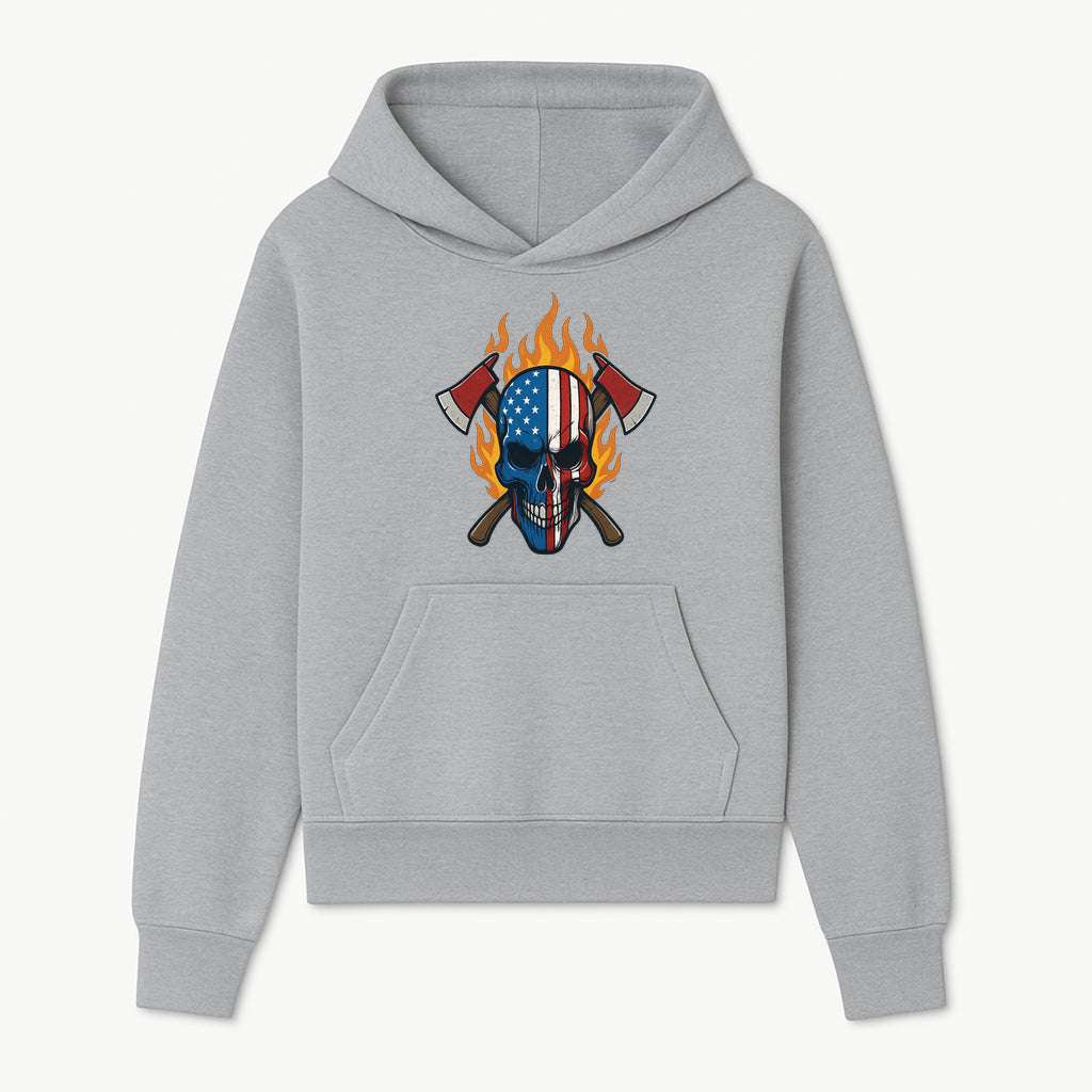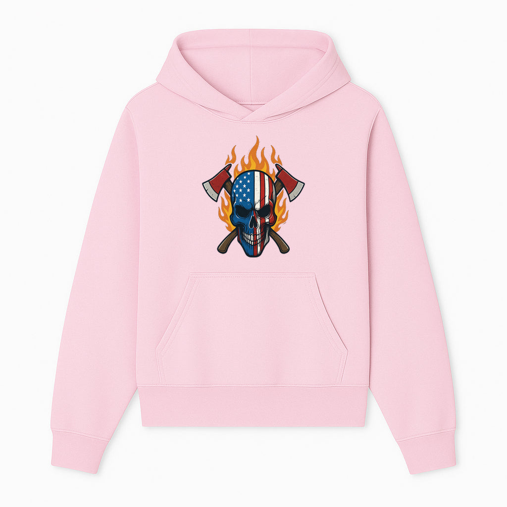 American Skull with Axes and Flames Graphic Tee, Patriotic Skull Design for Men, Edgy Firefighter T-Shirt, Unique Apparel Gift - Hoodie