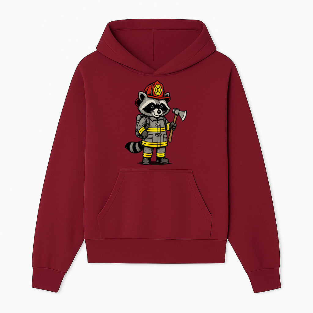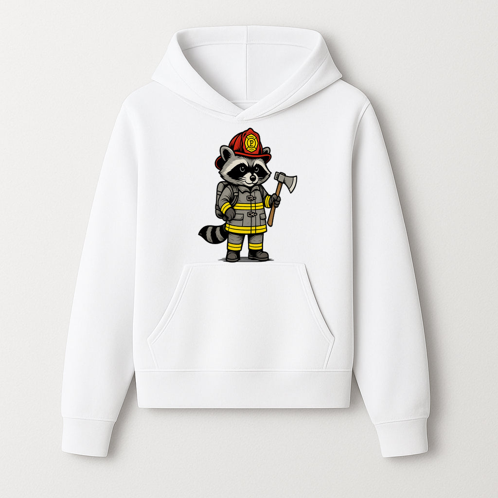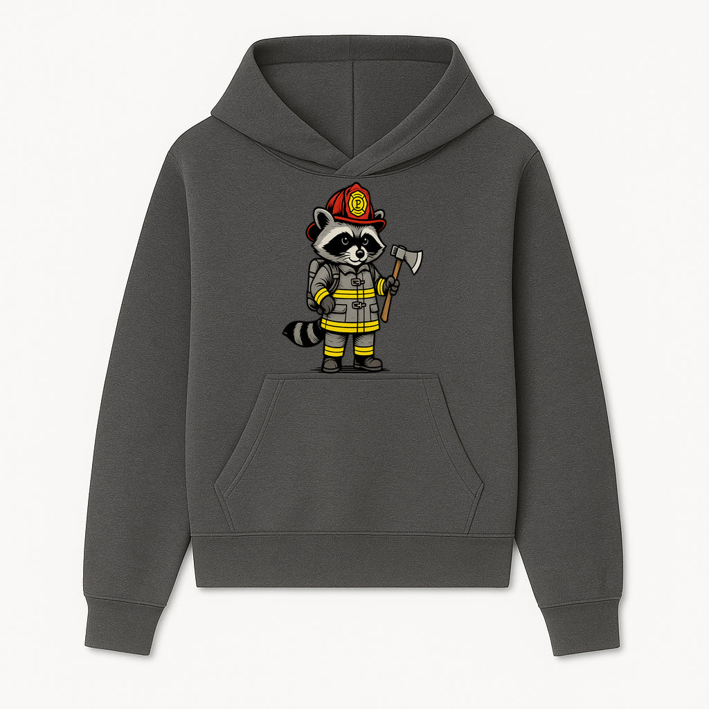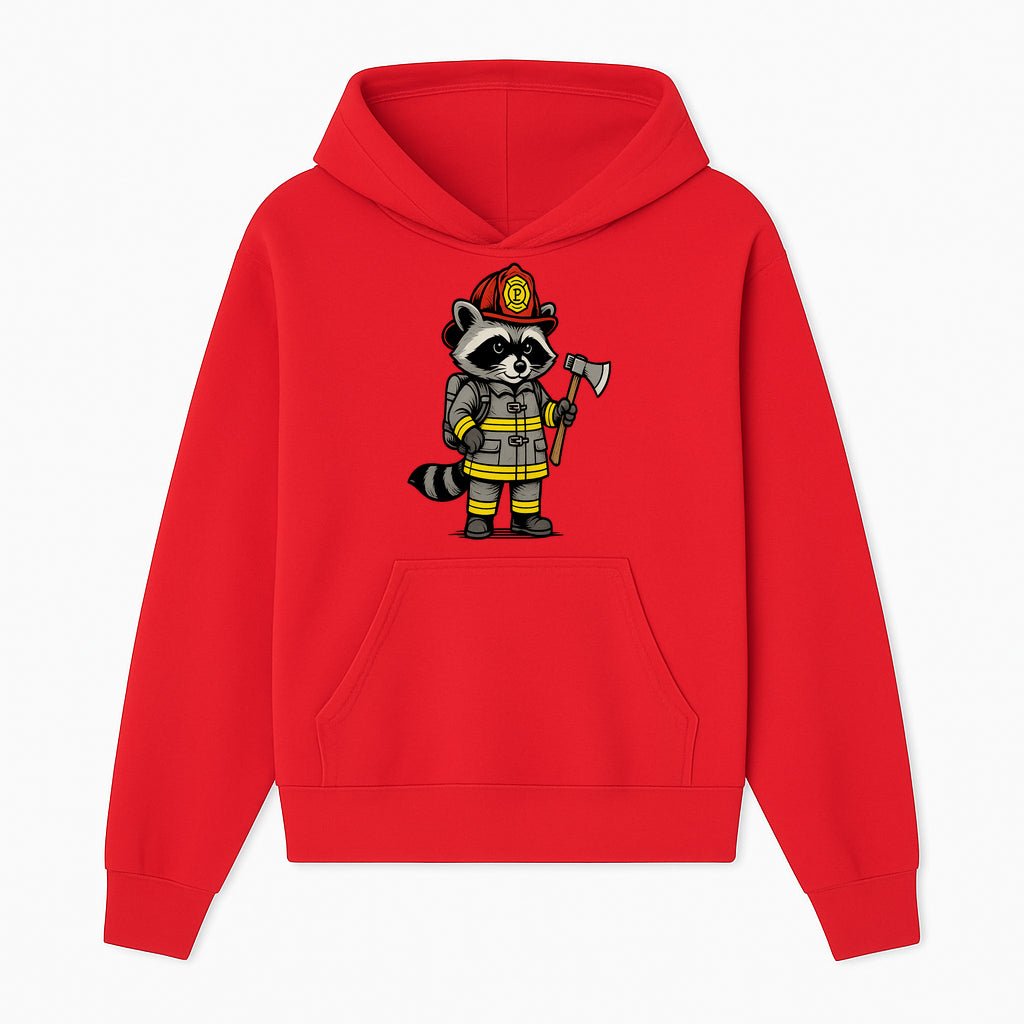 Cute Raccoon Firefighter Cartoon T-Shirt, Kids' Fireman Graphic Tee, Fire Safety Apparel, Animal Rescue, Gift for Boys and Girls - Hoodie