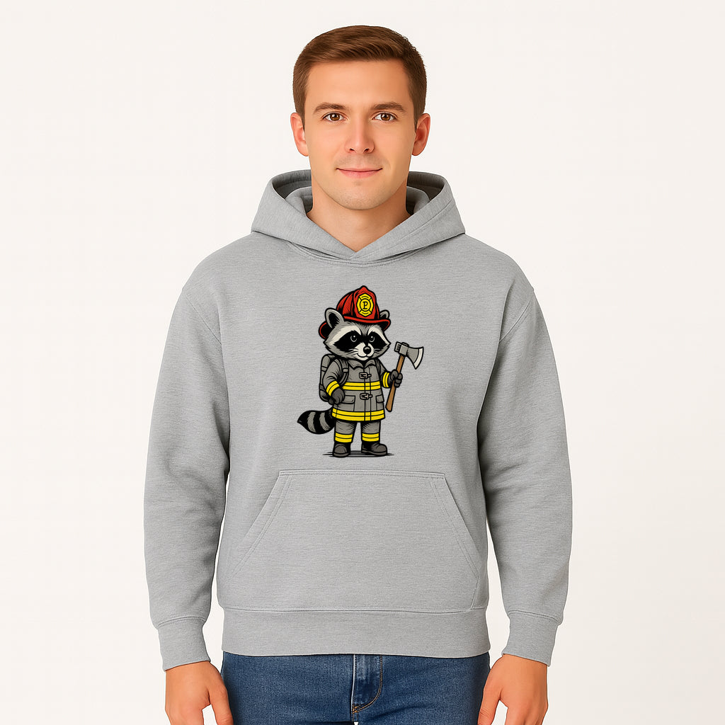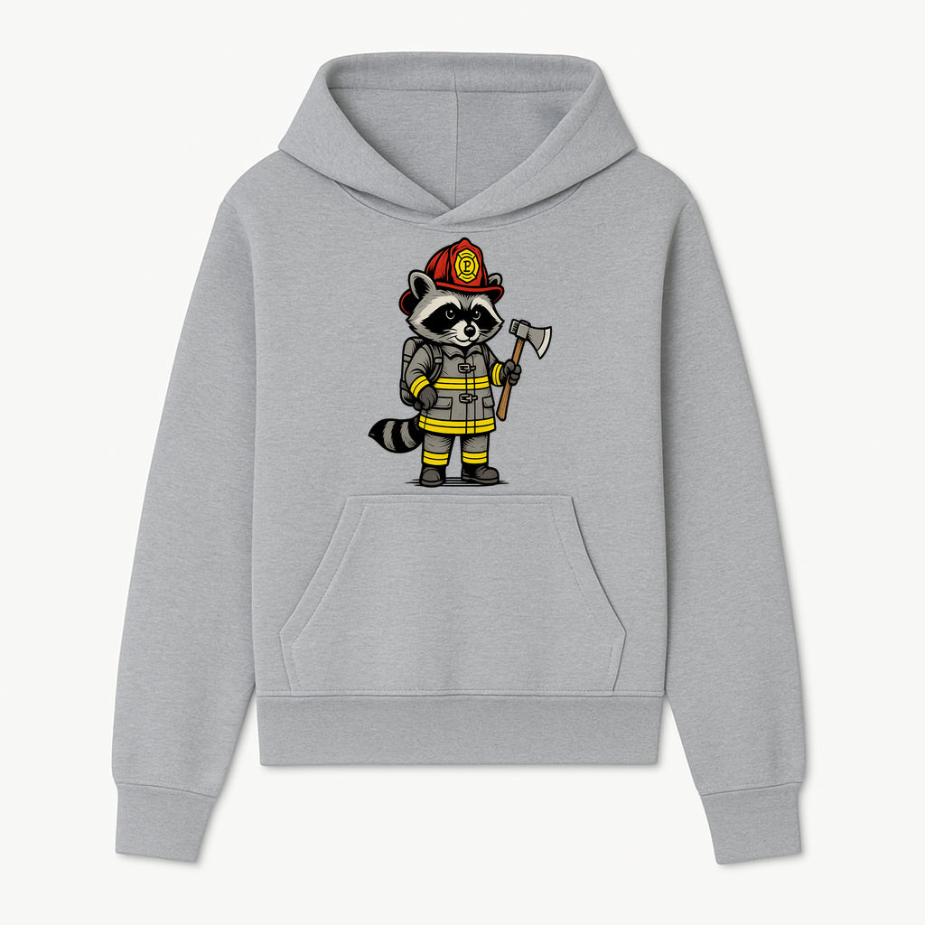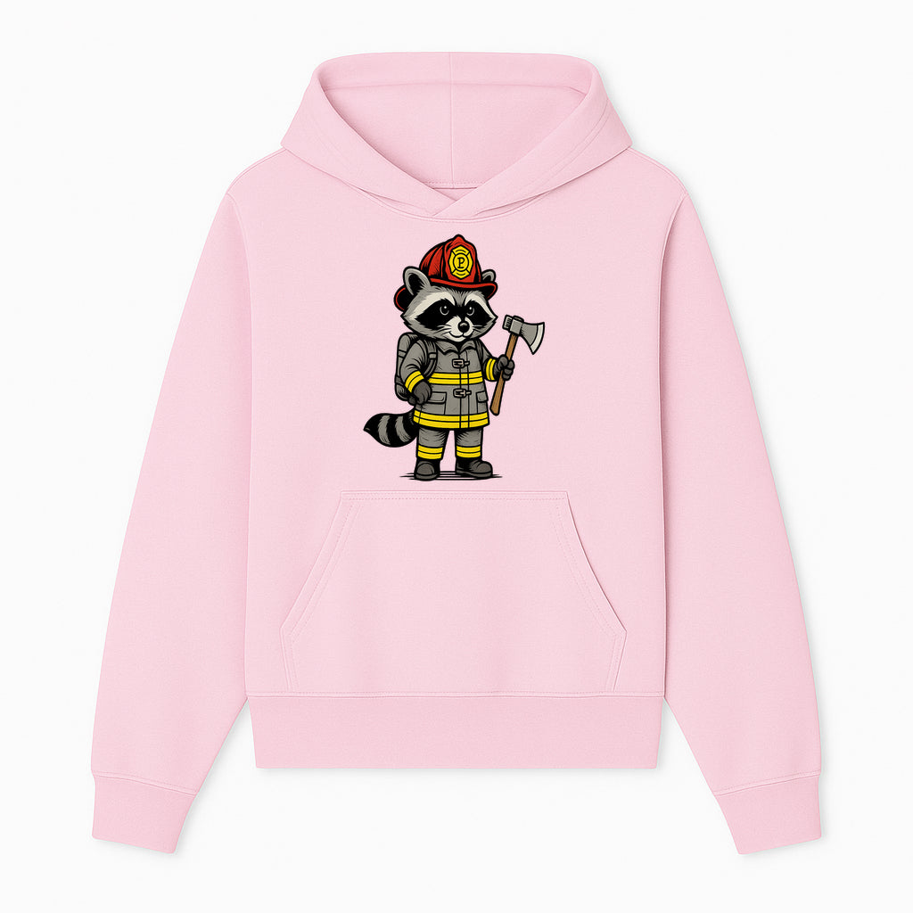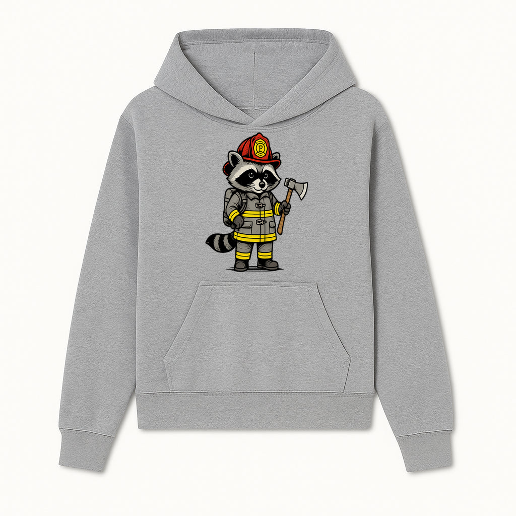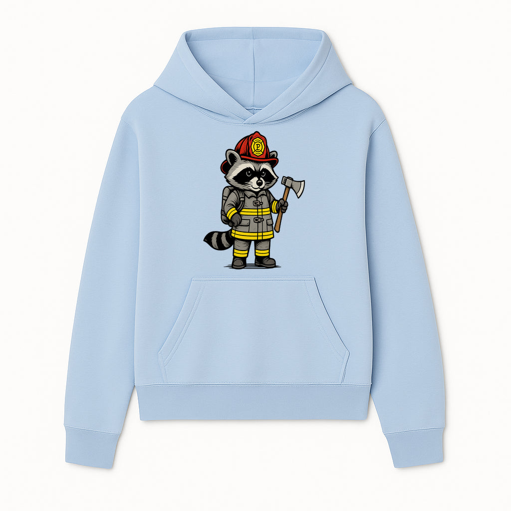 Cute Raccoon Firefighter Cartoon T-Shirt, Kids' Fireman Graphic Tee, Fire Safety Apparel, Animal Rescue, Gift for Boys and Girls - Hoodie