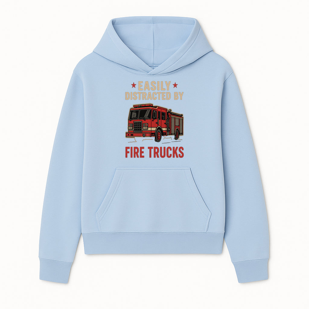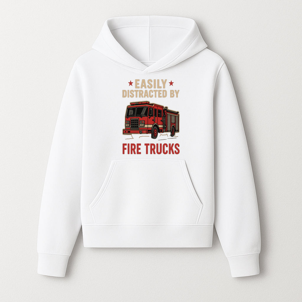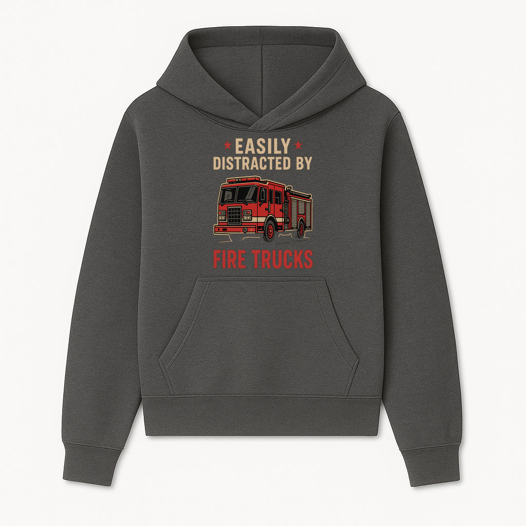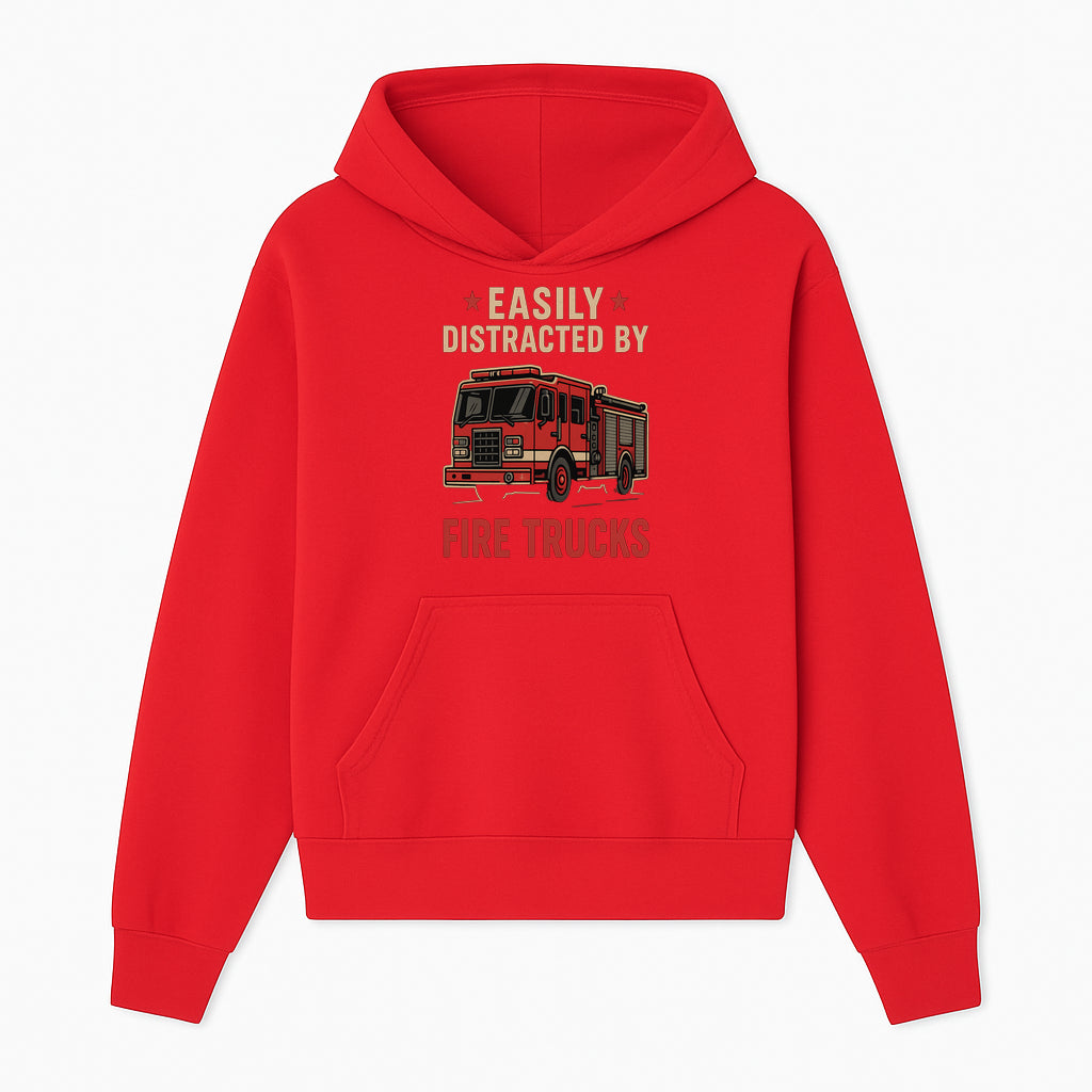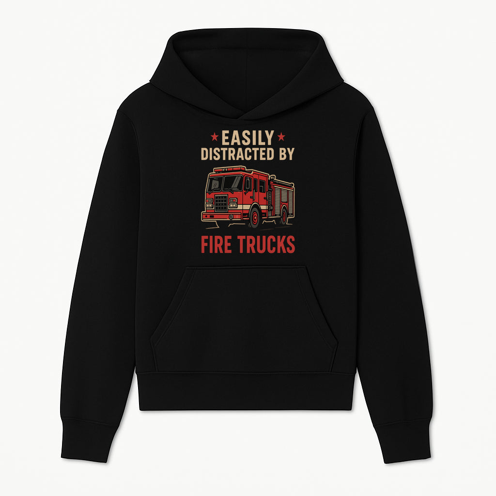 Easily Distracted by Fire Trucks Retro Graphic Tee | Firefighter Enthusiast Shirt | Fun Casual Wear - Hoodie