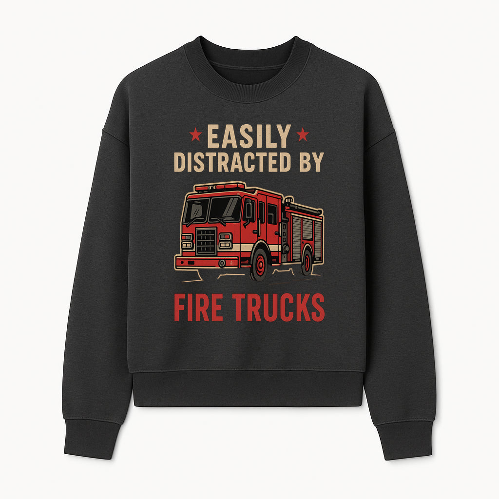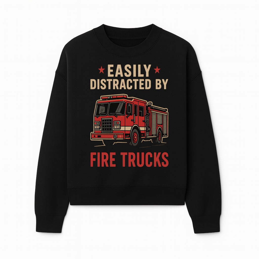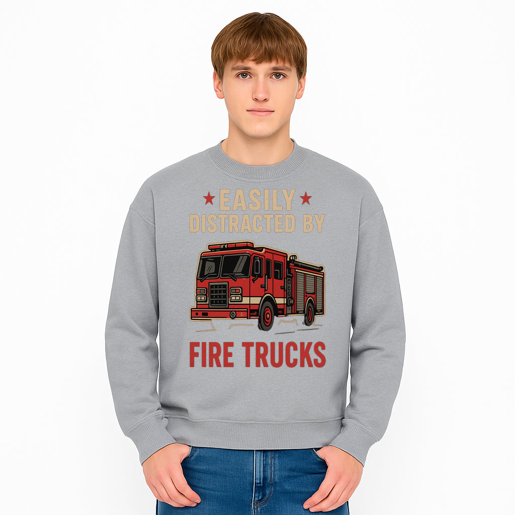 Easily Distracted by Fire Trucks Retro Graphic Tee | Firefighter Enthusiast Shirt | Fun Casual Wear - Sweatshirt