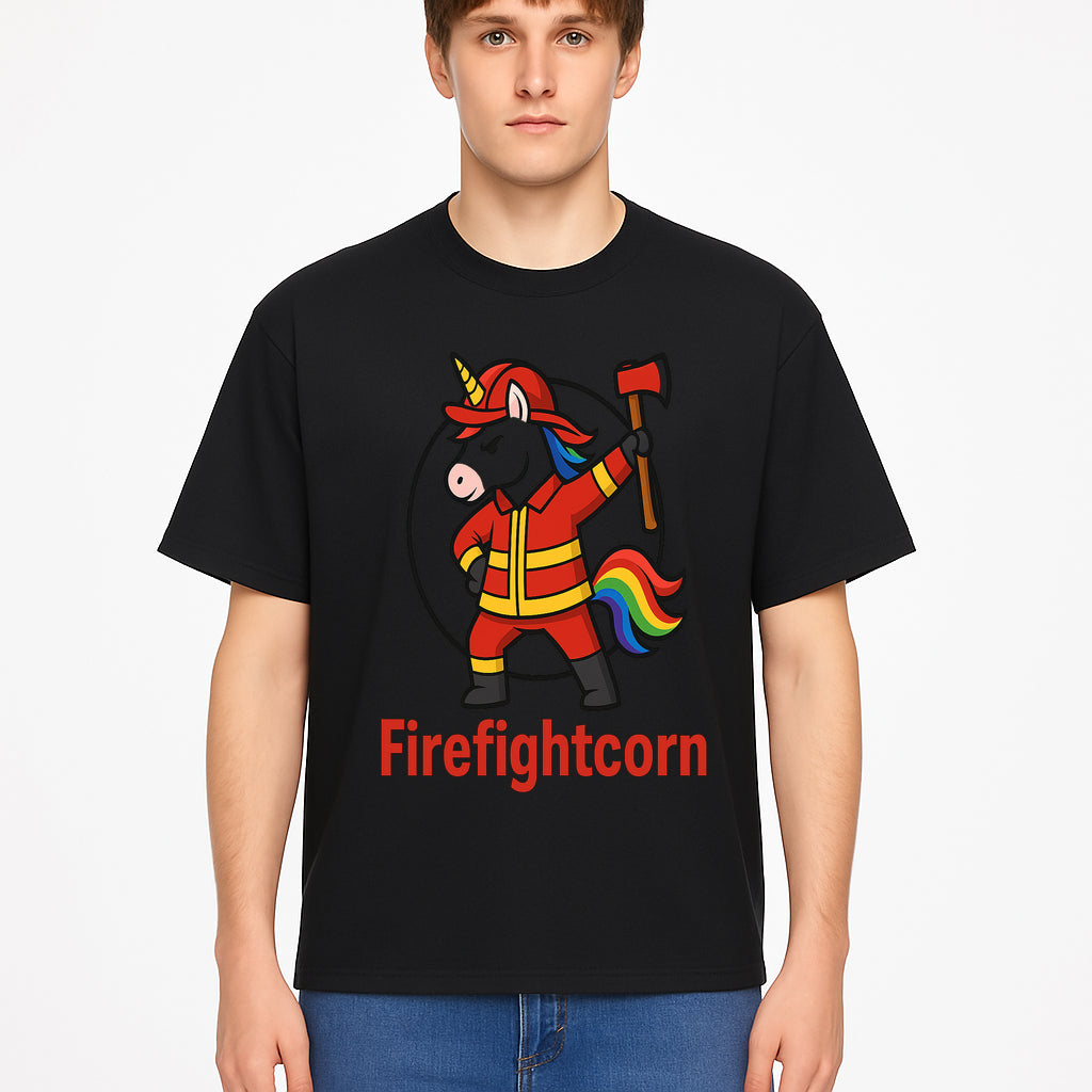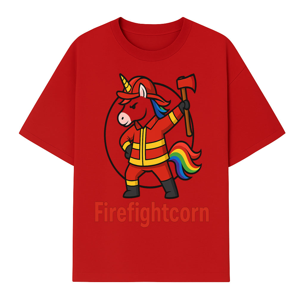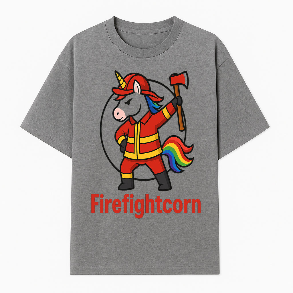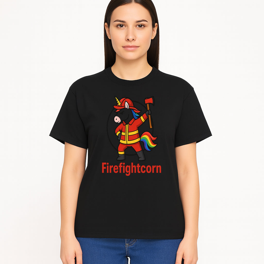 Firefightcorn Unicorn Hero T-Shirt | Cute Firefighter Graphic Tee | Rainbow Mane Casual Wear for Kids & Adults - T-shirt