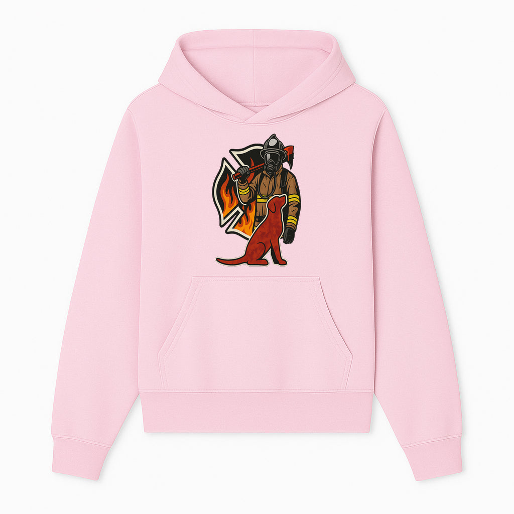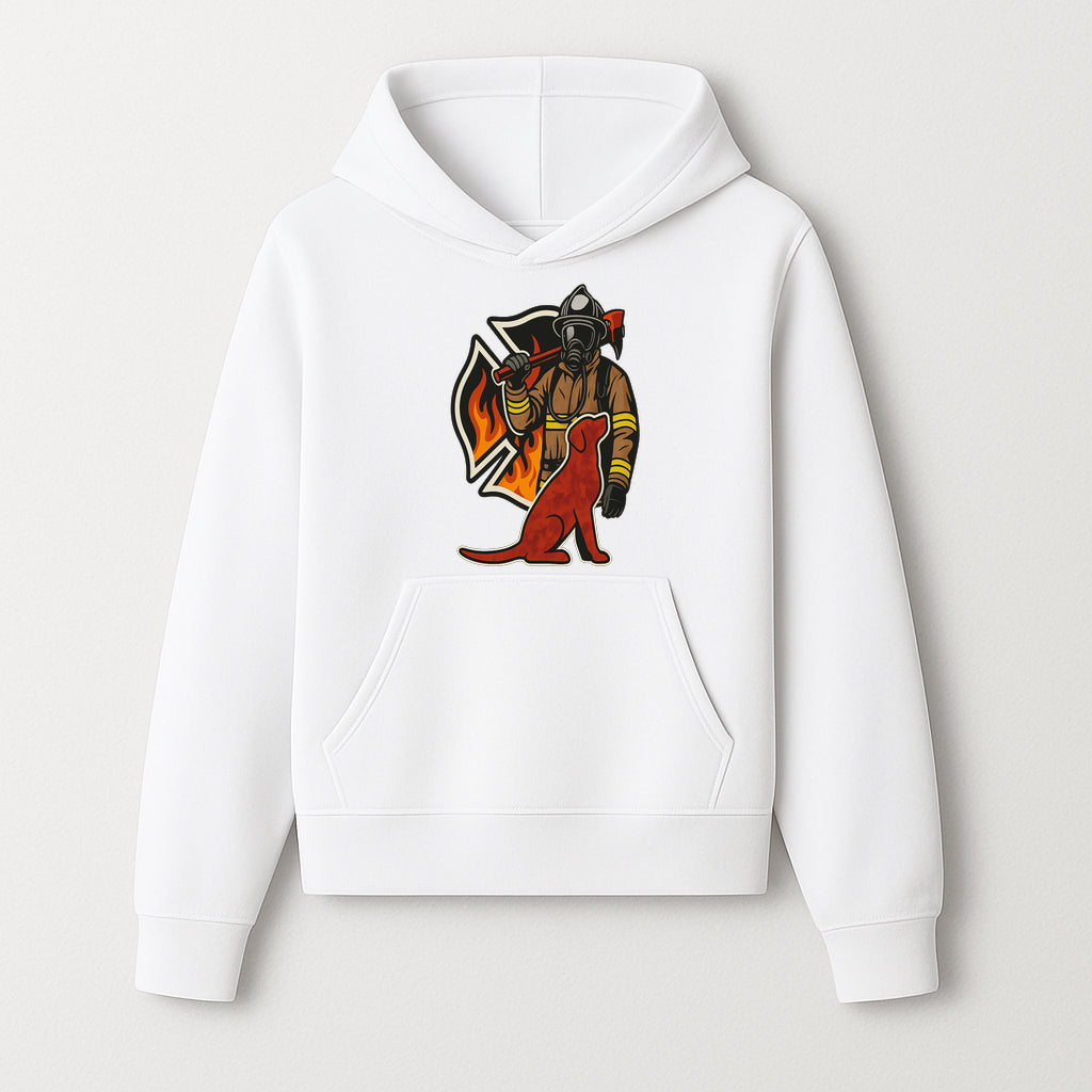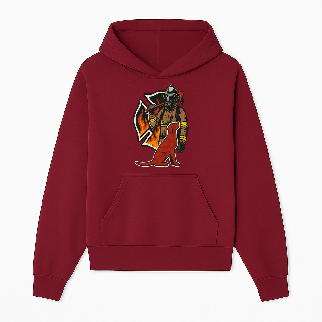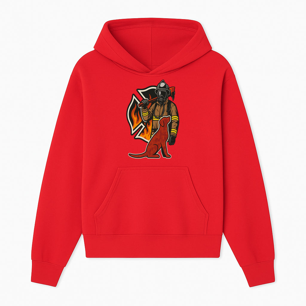 Firefighter and Dog Graphic Art | Fire Rescue Hero Design | Fireman with Mascot | Firefighting Gifts | Wall Art Decor - Hoodie