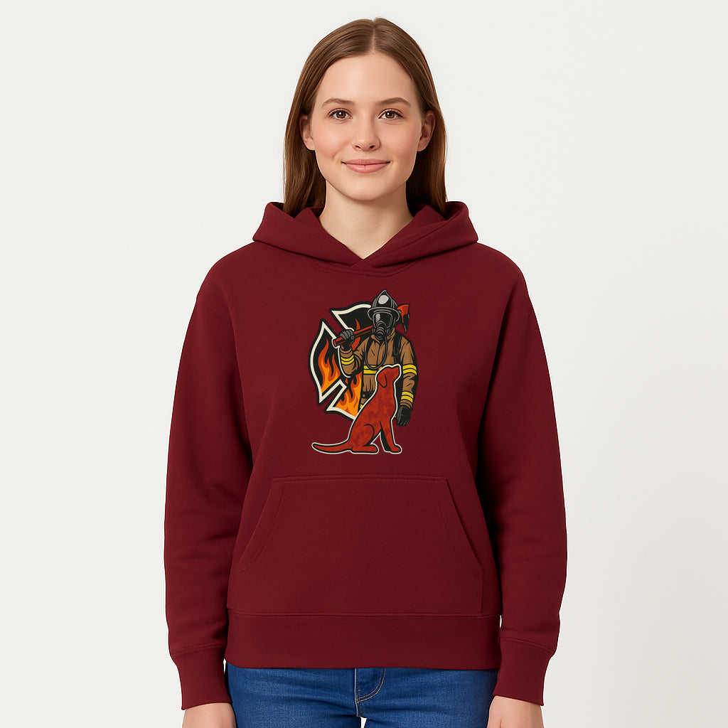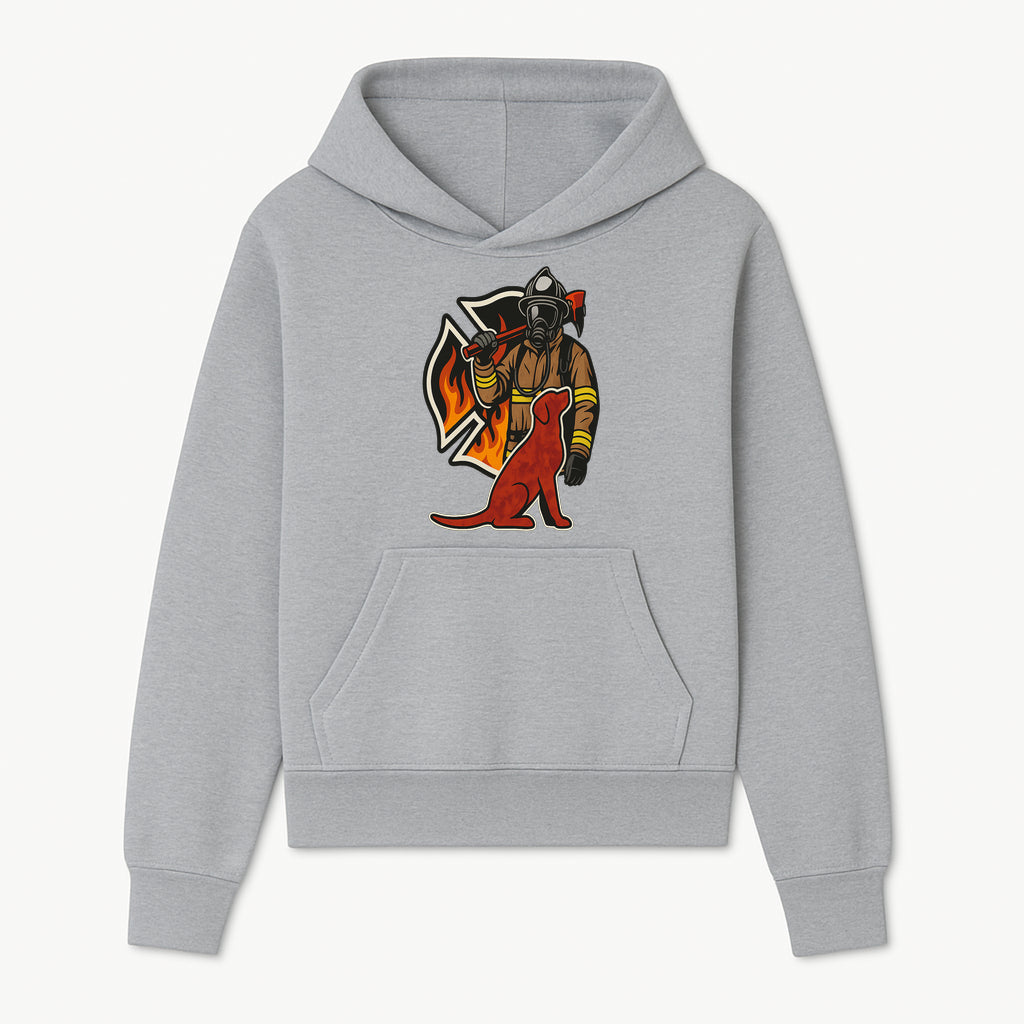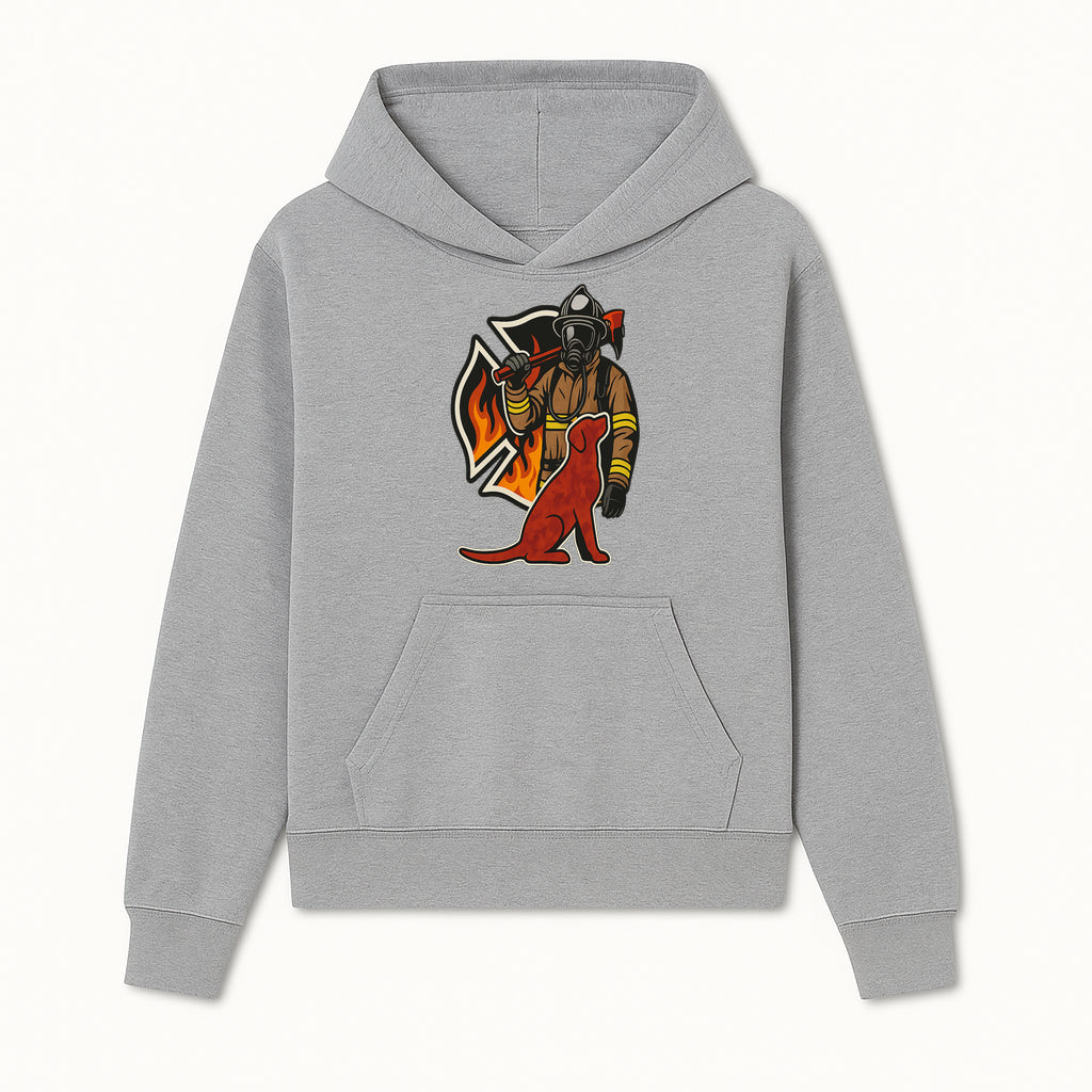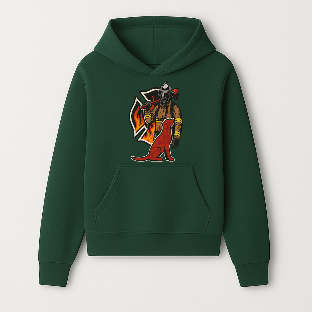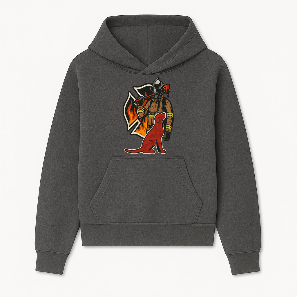 Firefighter and Dog Graphic Art | Fire Rescue Hero Design | Fireman with Mascot | Firefighting Gifts | Wall Art Decor - Hoodie