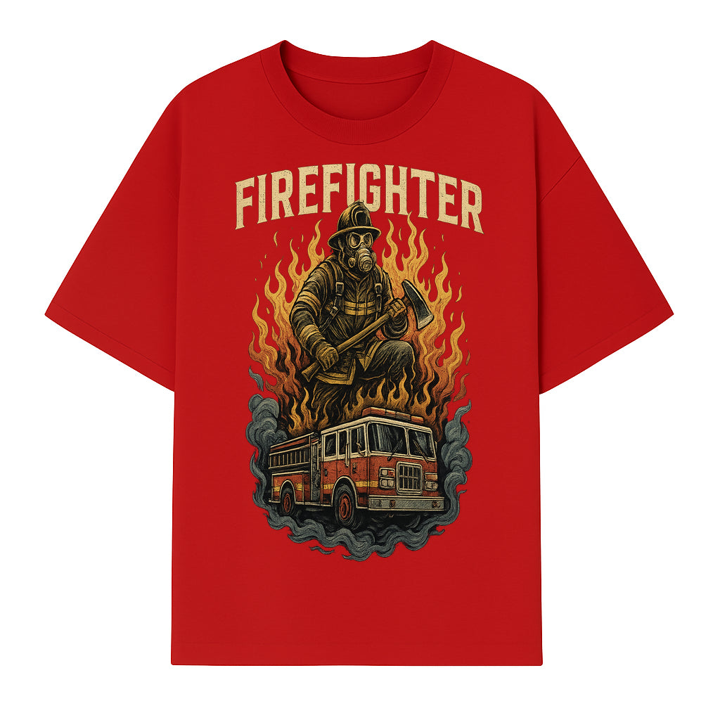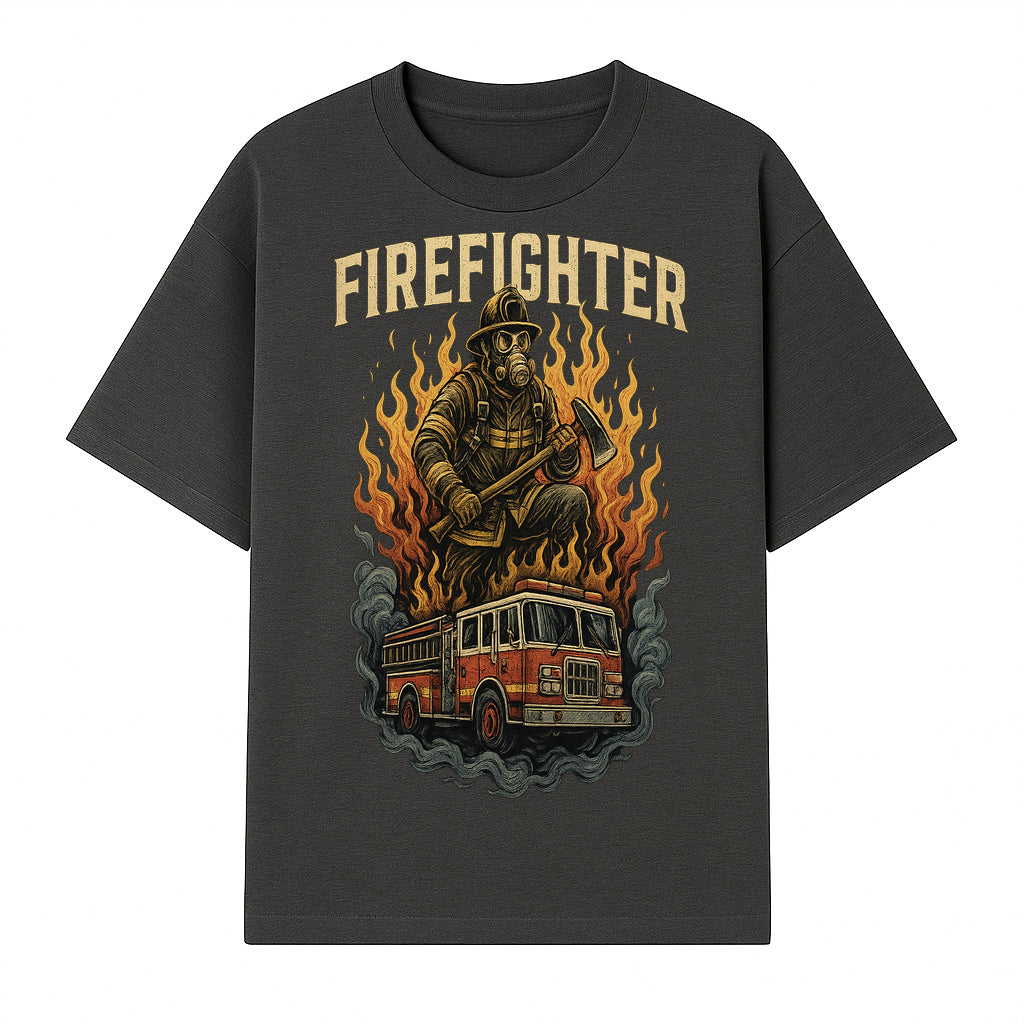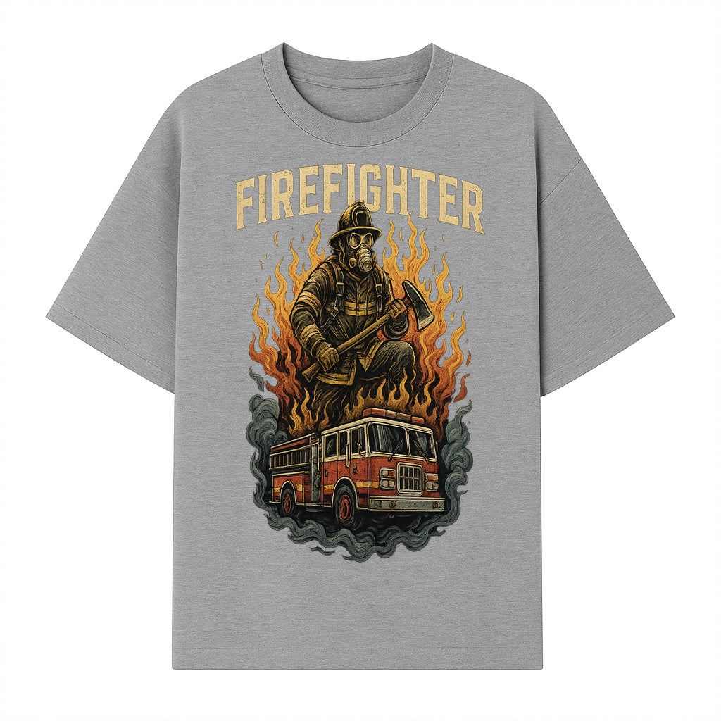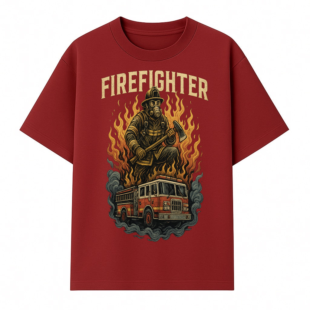 Firefighter Graphic Tee: Heroic Fireman with Axe and Fire Truck Design, Perfect for Firefighter Fans and Supporters - T-shirt