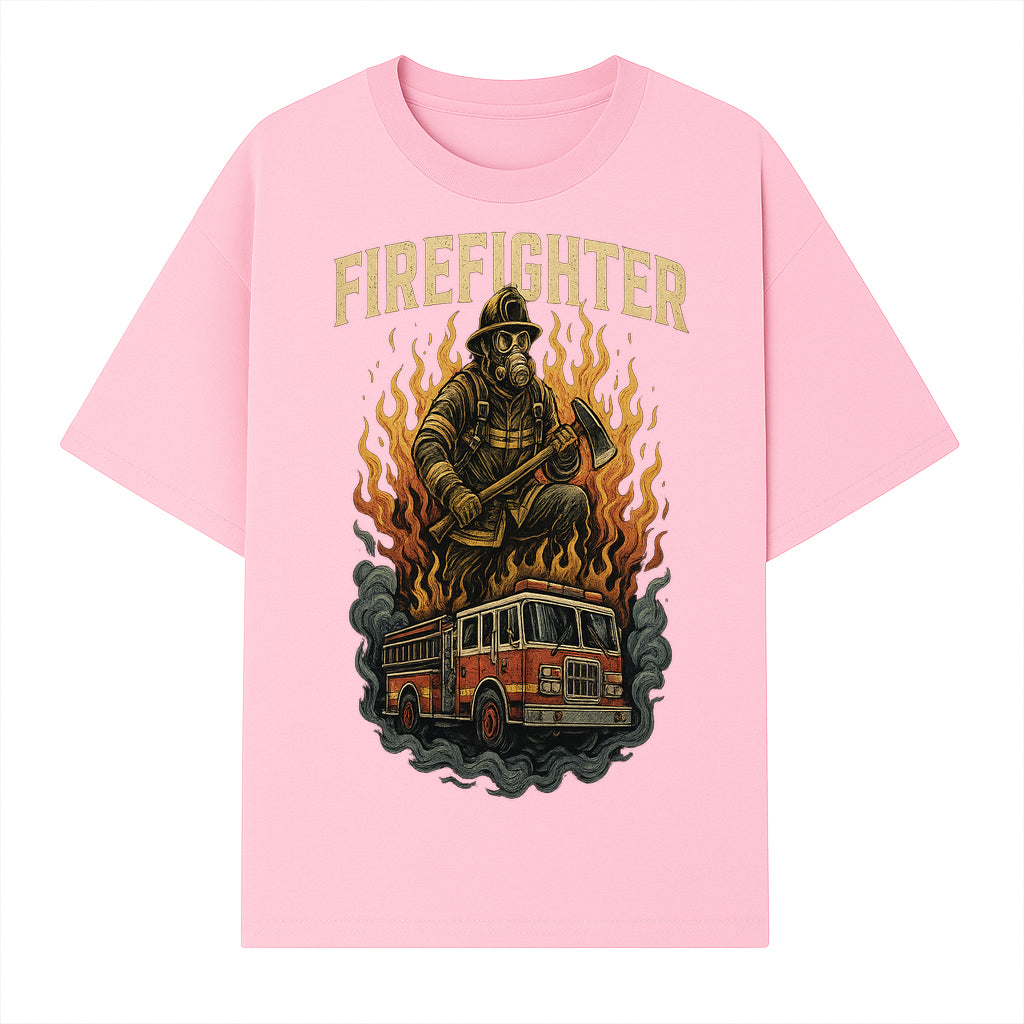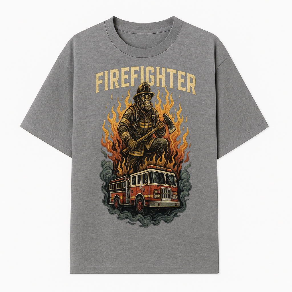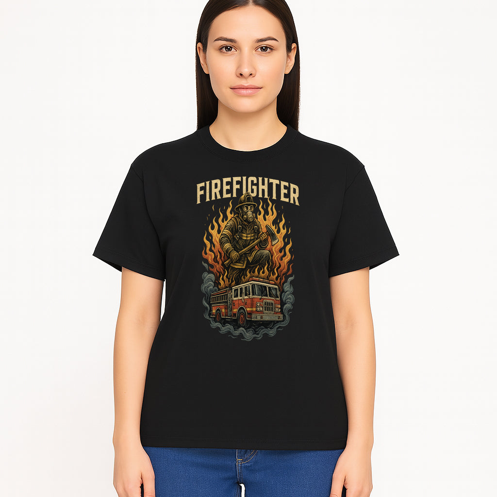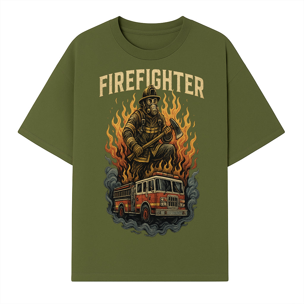 Firefighter Graphic Tee: Heroic Fireman with Axe and Fire Truck Design, Perfect for Firefighter Fans and Supporters - T-shirt