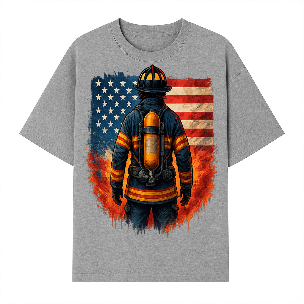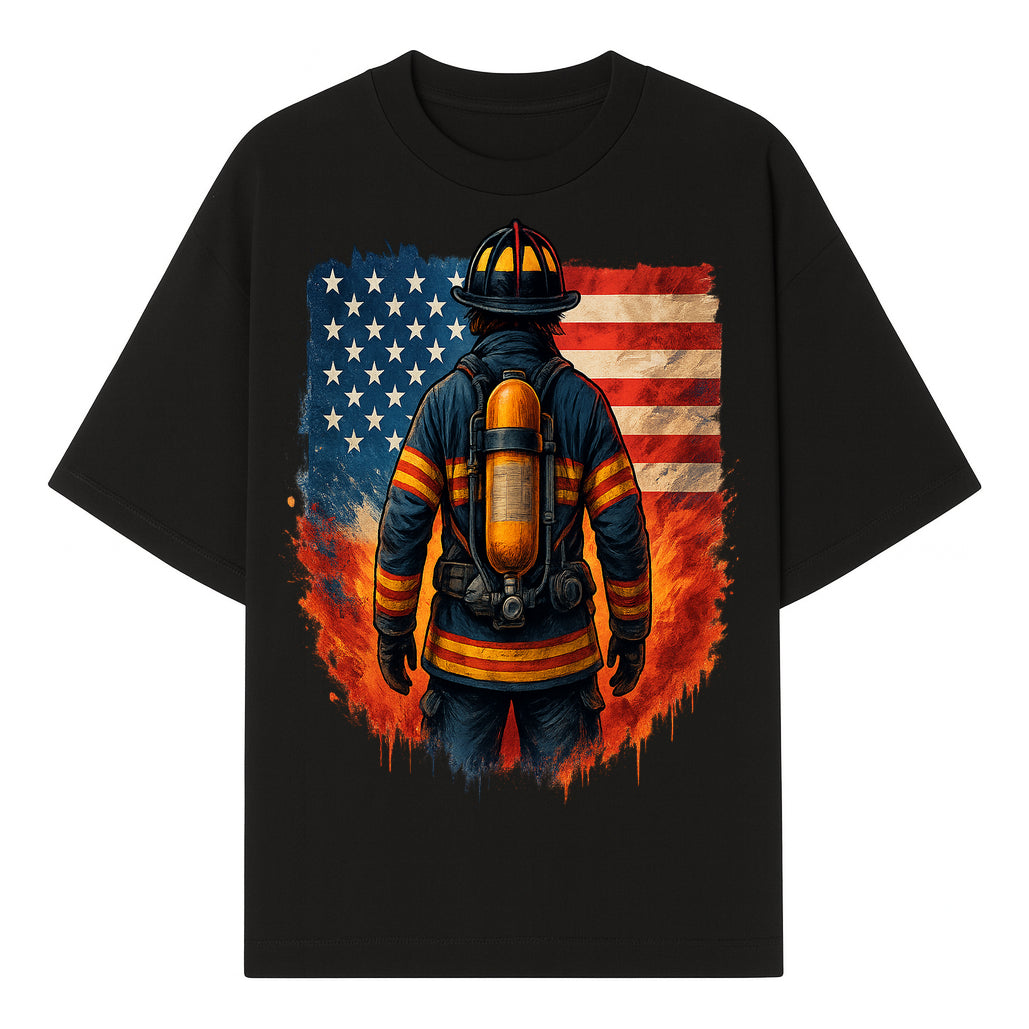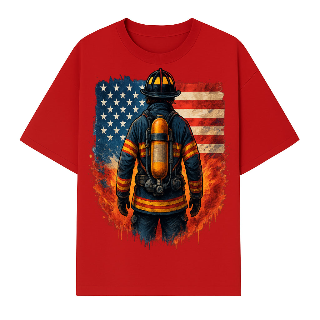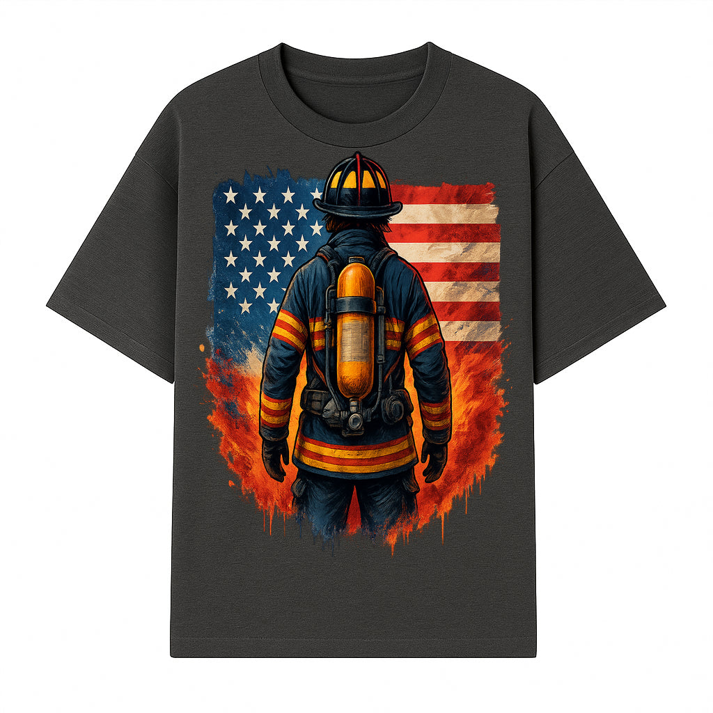 Patriotic Firefighter Artwork - American Flag Fireman Graphic Tee - Heroes Among Us T-Shirt for Firefighter Appreciation - T-shirt
