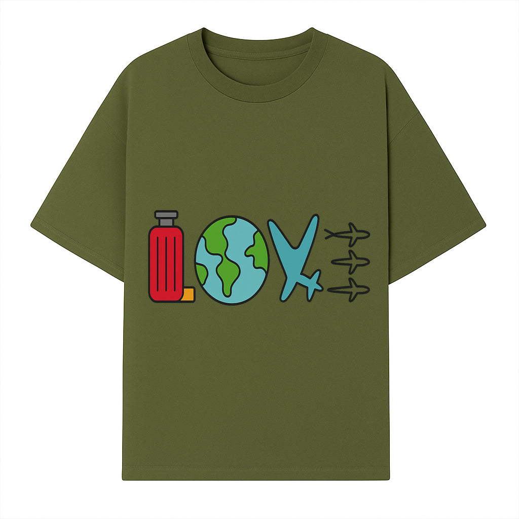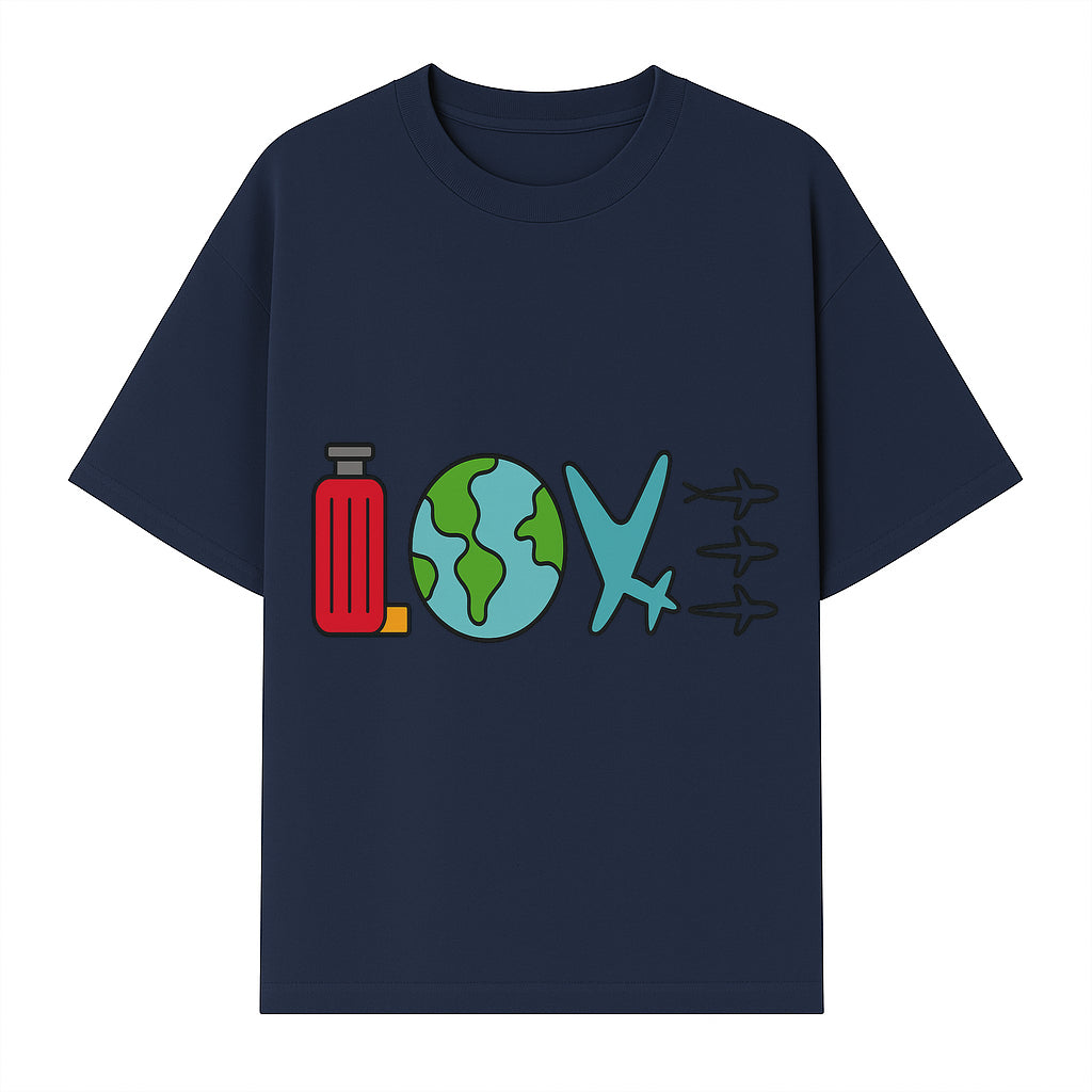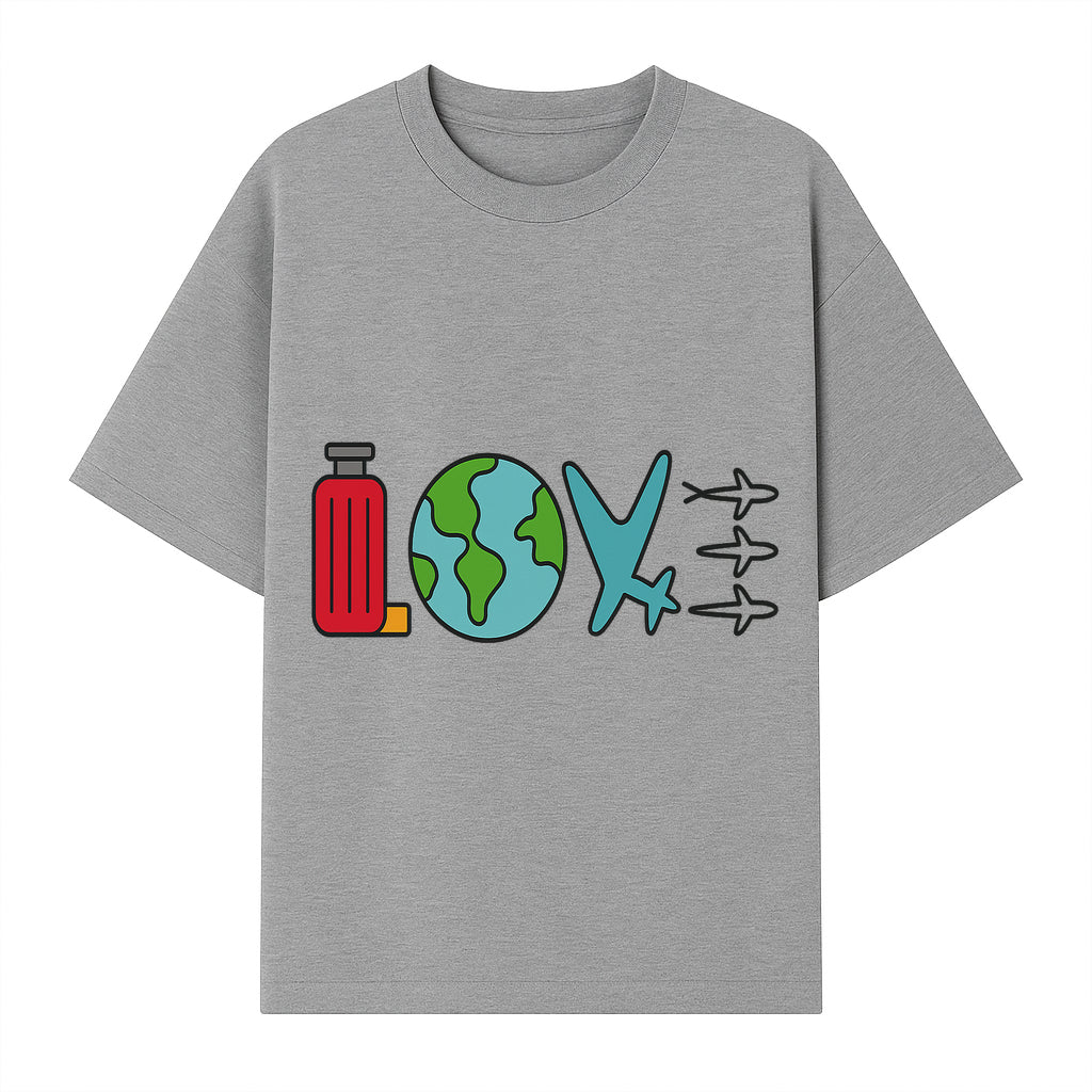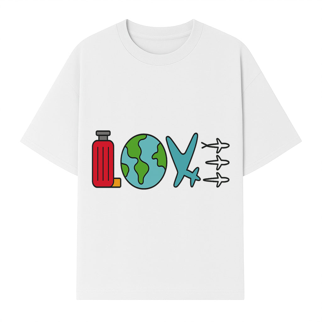 Travel Themed Love Design with Suitcase, Globe, Airplane, and Planes - Perfect for Adventurers and Wanderlust Gifts - T-shirt