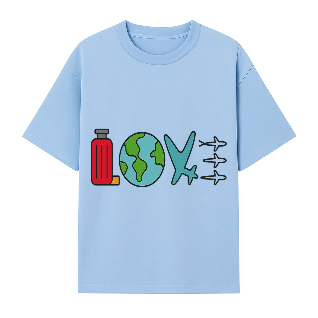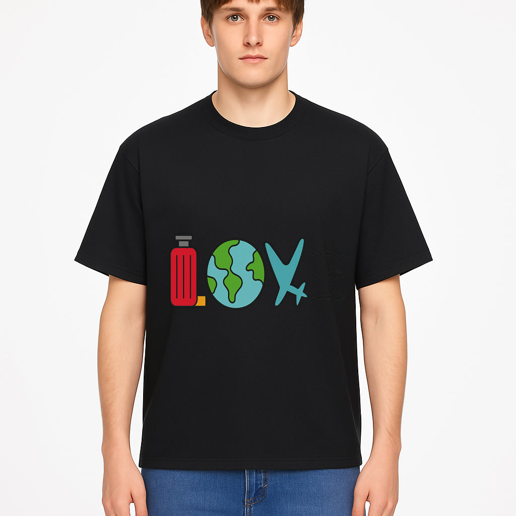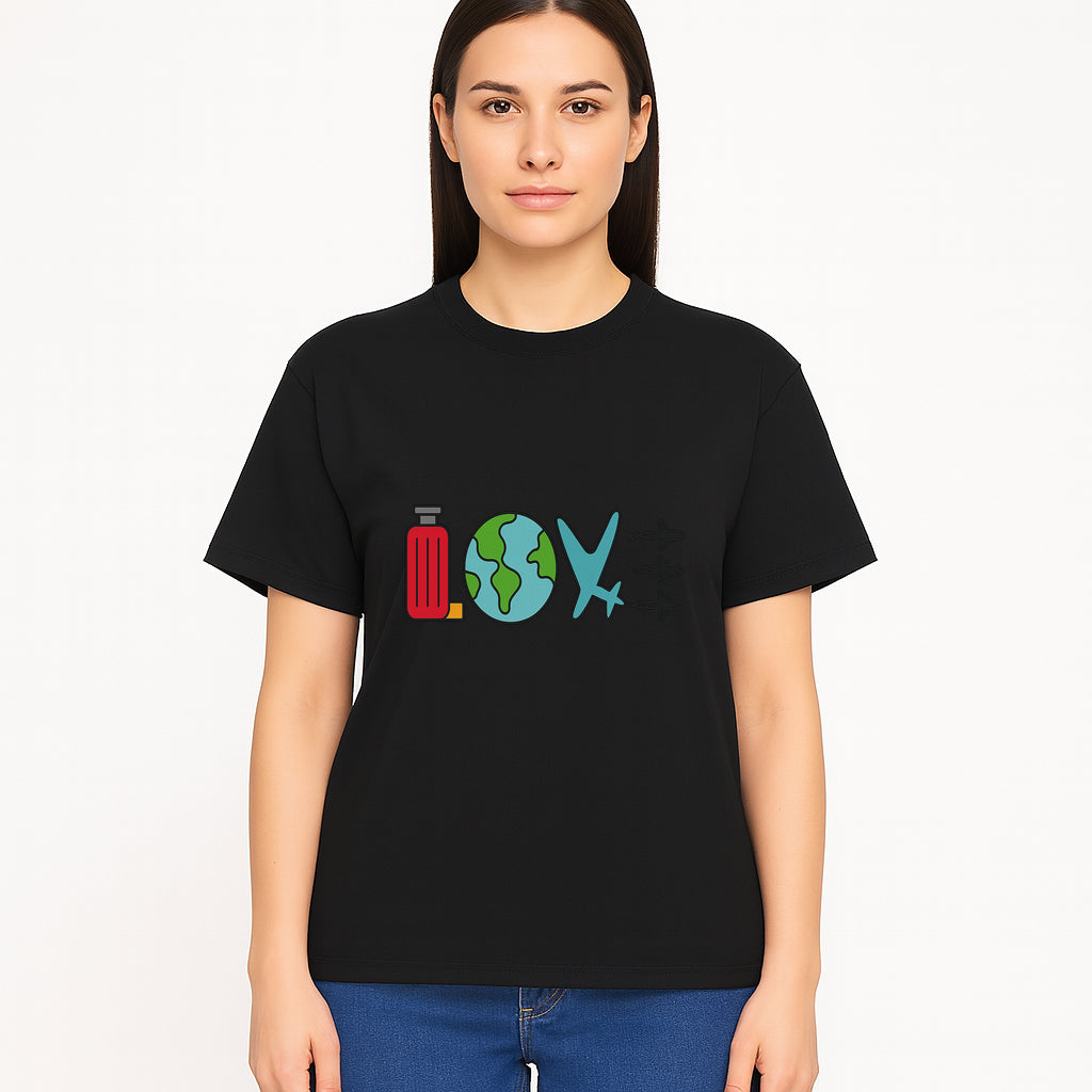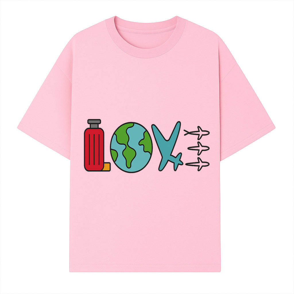 Travel Themed Love Design with Suitcase, Globe, Airplane, and Planes - Perfect for Adventurers and Wanderlust Gifts - T-shirt