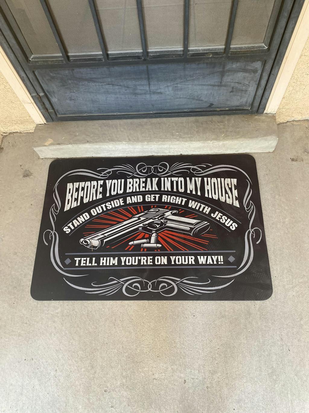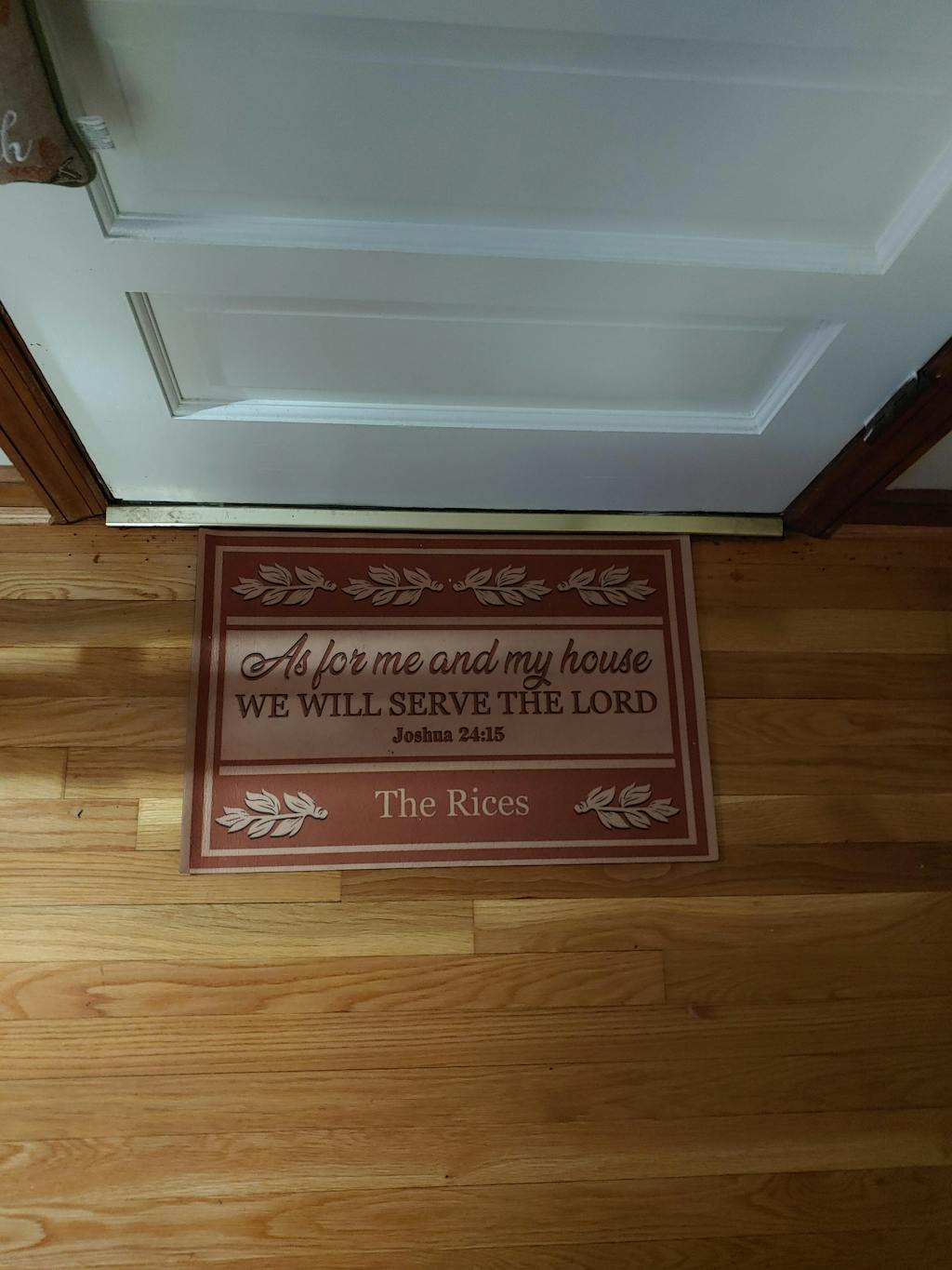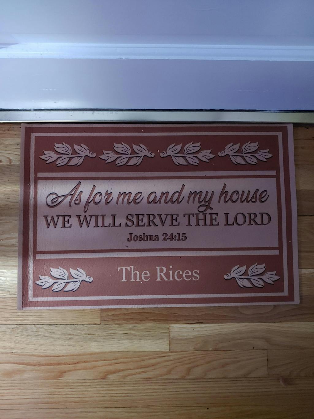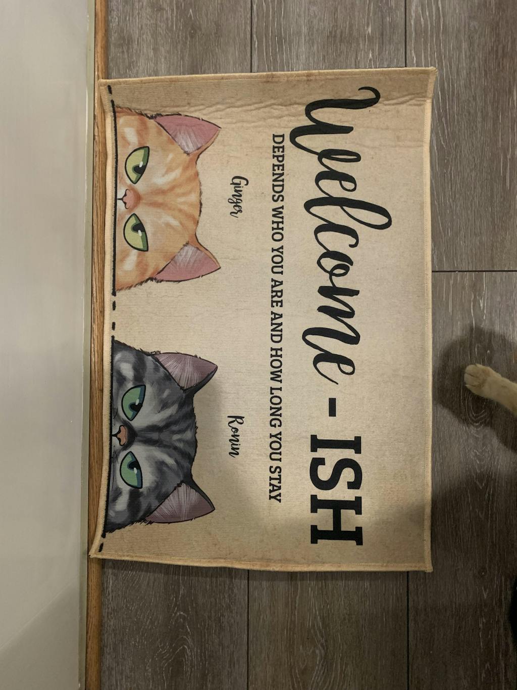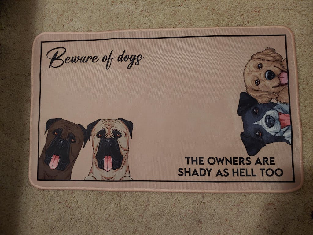 Mat is very nice quality. Got this made up for my daughter for christmas. She has 4 dogs who are her kids. Its is a lighter weight mat so I will recommend she uses it in front of her kitchen sink, that way she will see it more often and can enjoy it more. We have strong winds here and could possibly be blown away.