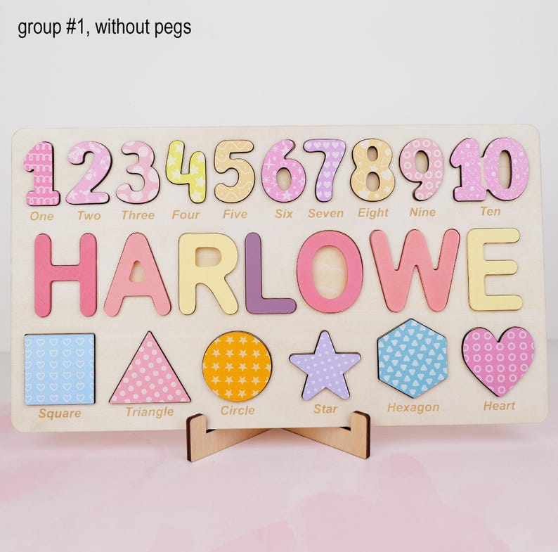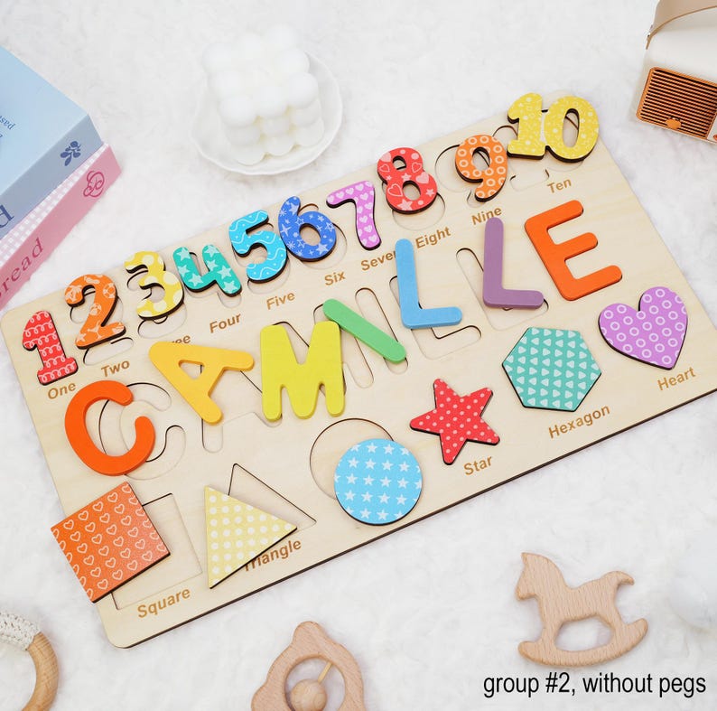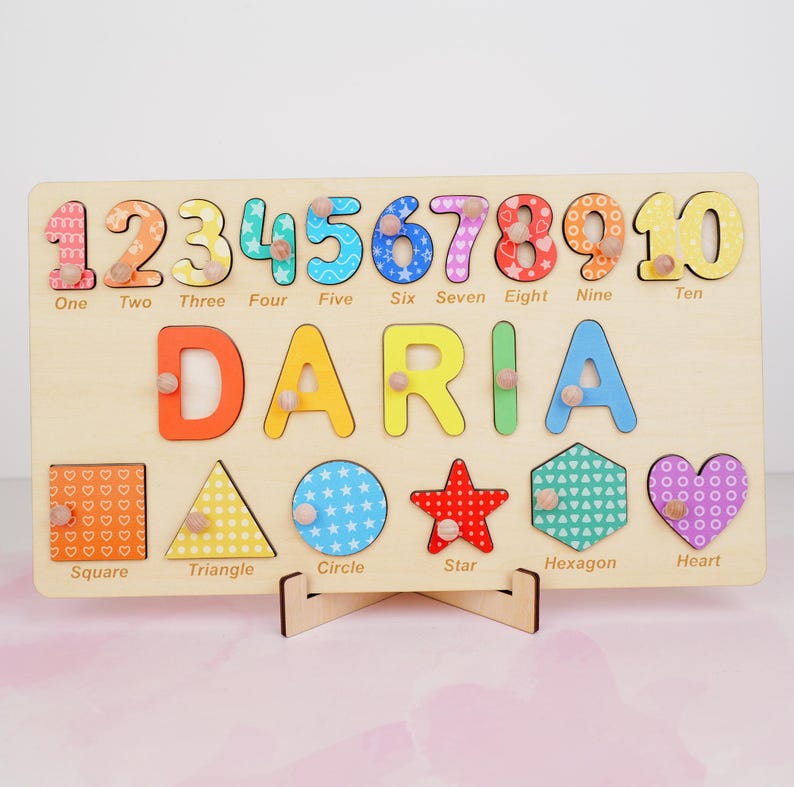 Personalized Wooden Name Puzzle Gift for Boys & Girls, Custom Baby Gifts Name Puzzle with Numbers, Geometry Shapes, Free Back Engraving
