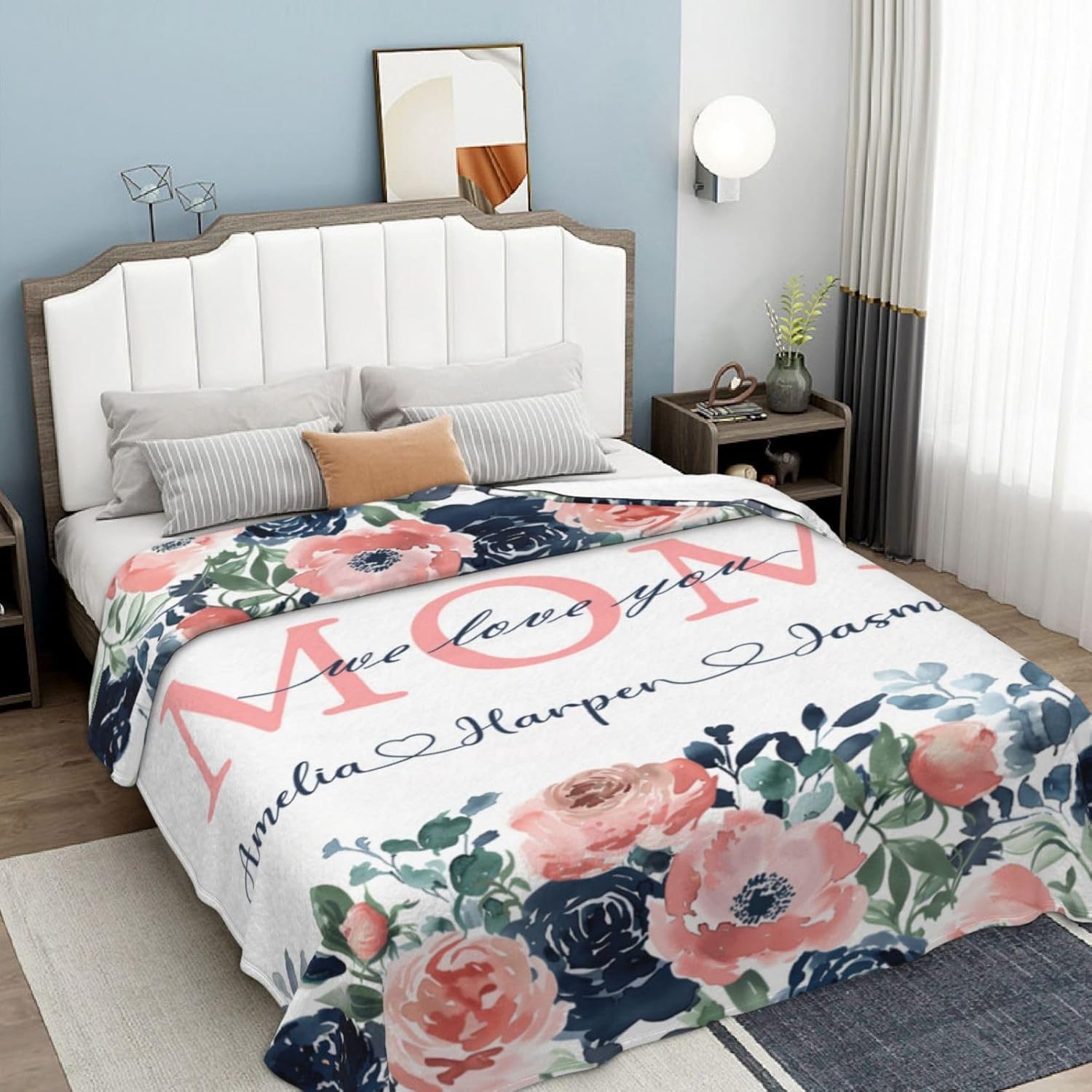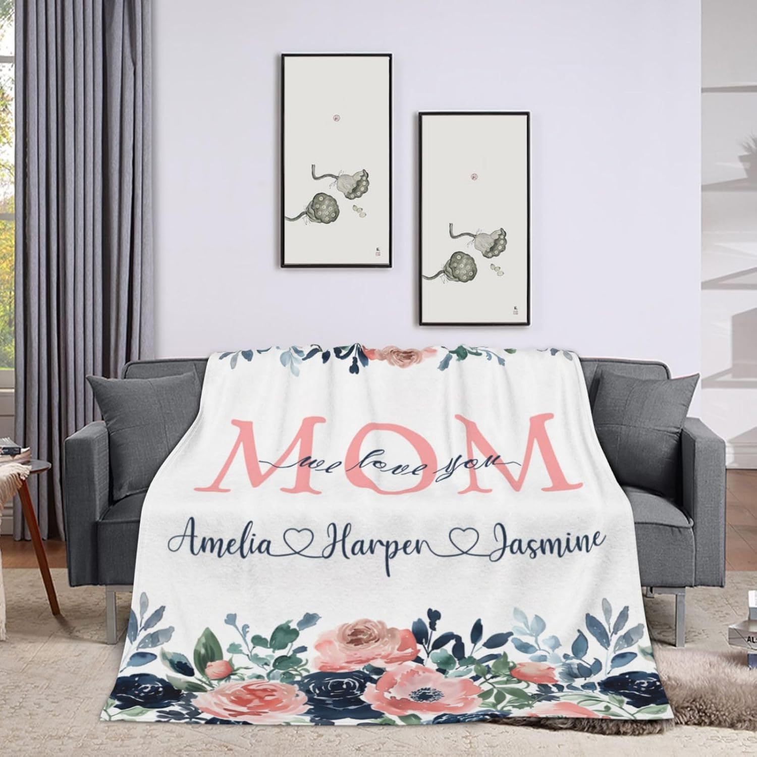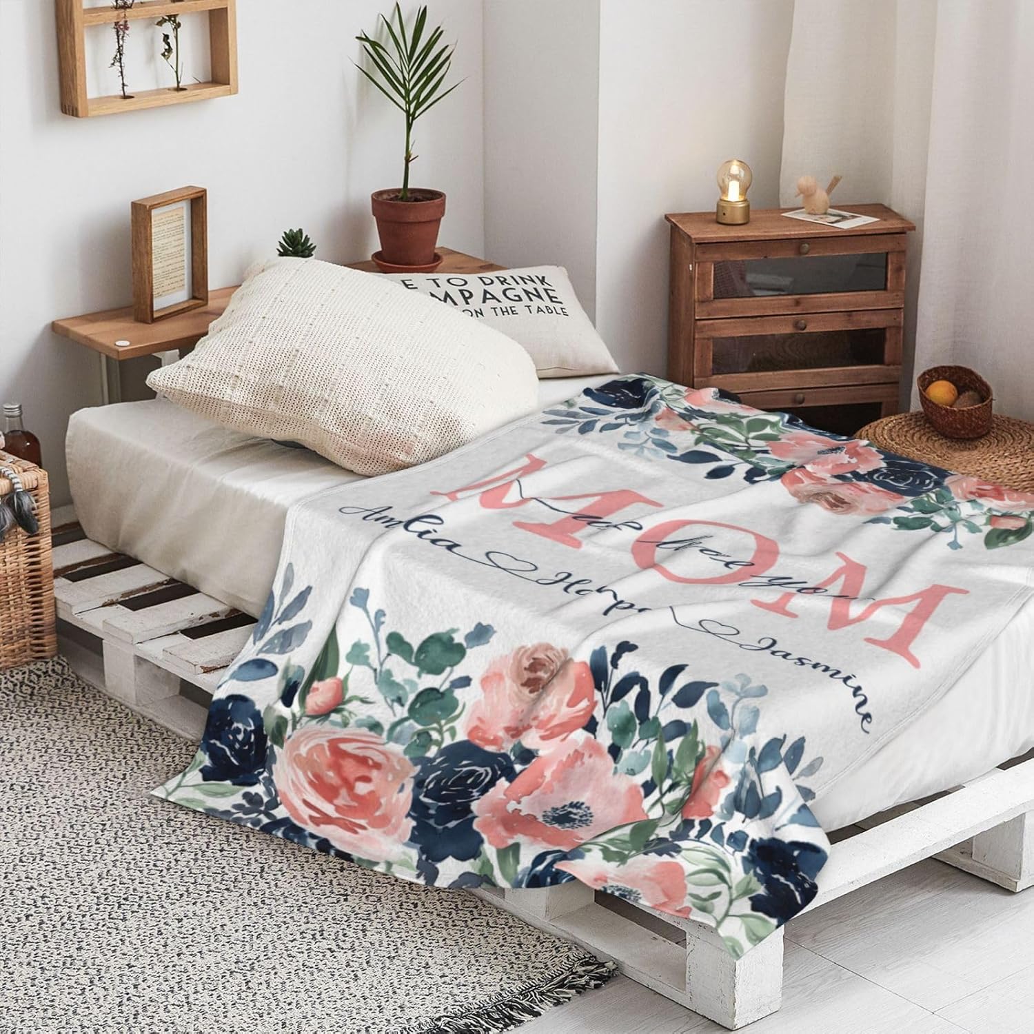 Mothers Day Birthday Gifts for Mom Personalized Blanket with Name for Grandma Mom's Garden Birthday Gift for Grandmother Mom Nana Gigi Mimi Mommy (Blue)