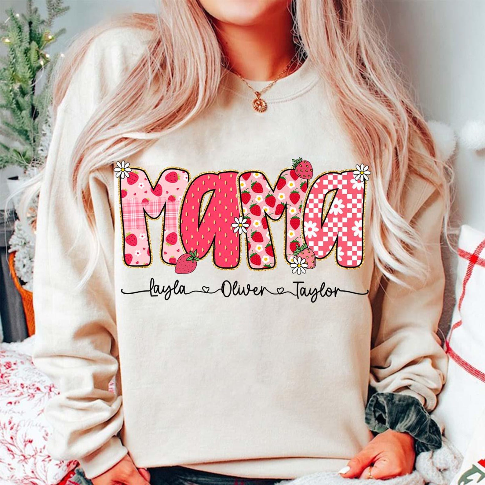 Preppy Mama Strawberry Glitter, Cute Strawberry Floral Mama with kids names, Custom Preppy Mama