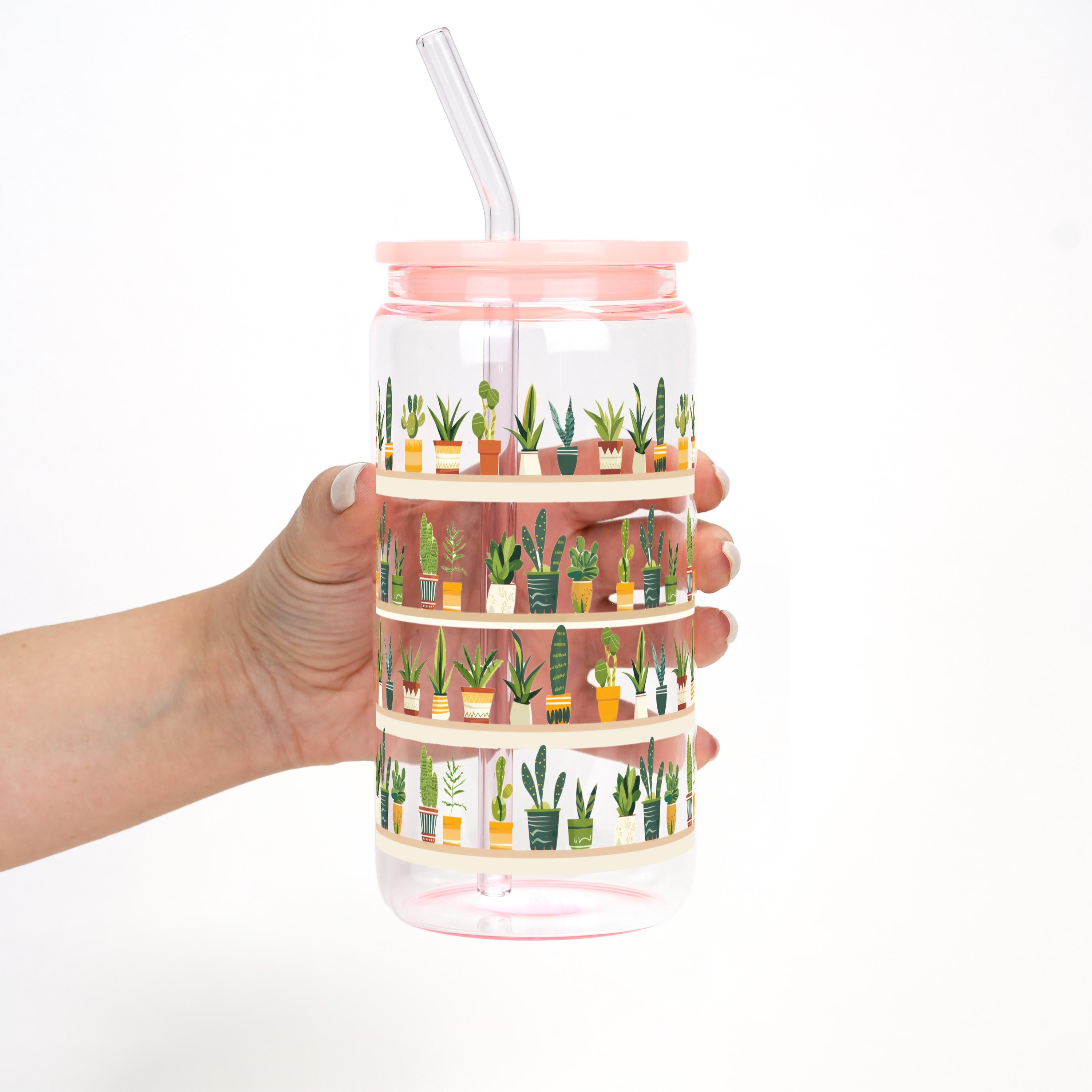 Succulent Glass Tumbler, Cactus and Houseplant Iced Coffee Glass Cup with Lid and Straw, Plant Lover Gift