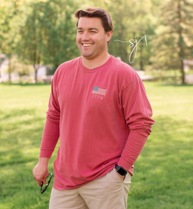 1776 Embroidered American Flag Tee Tank Long Sleeve Crewneck Sweatshirt Patriotic Vintage Inspired 4th Of July Usa Shirt