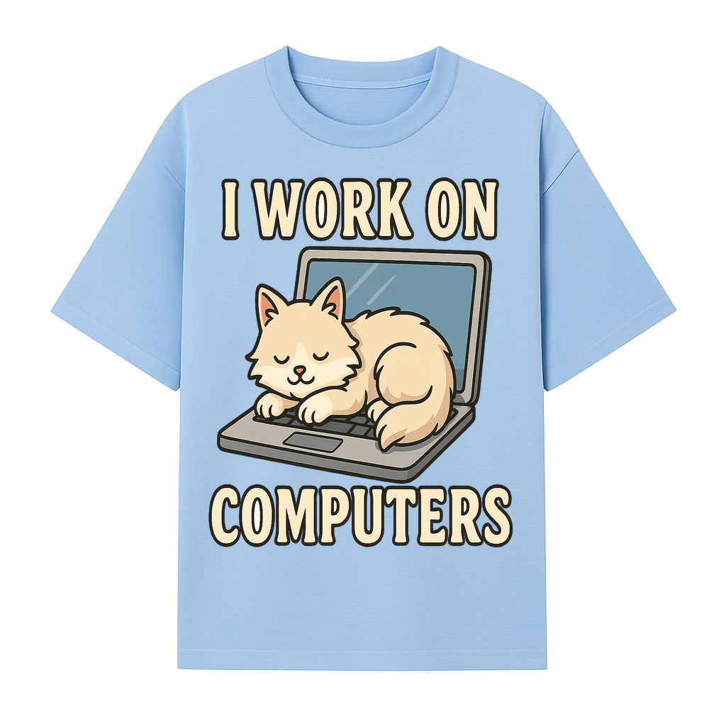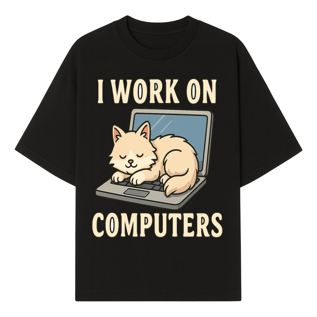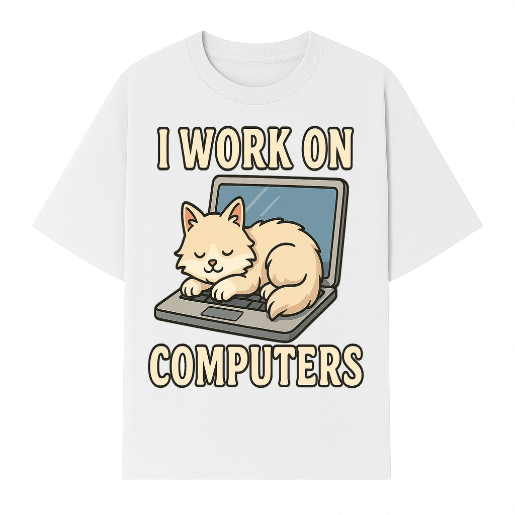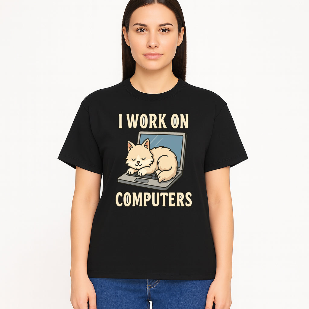Funny Cat Gift - I Work on Computers Laptop Design - Cute Cat Lover's Work from Home T-Shirt or Mug - T-shirt
