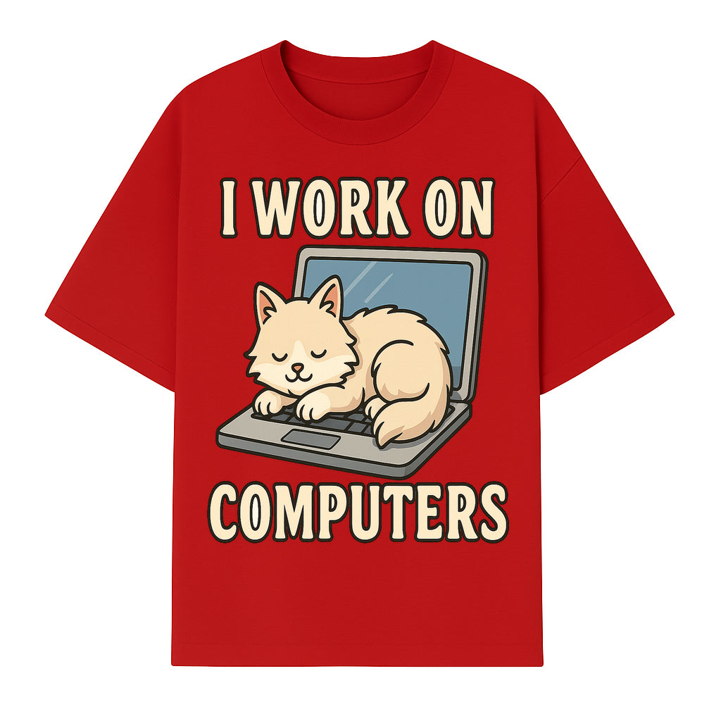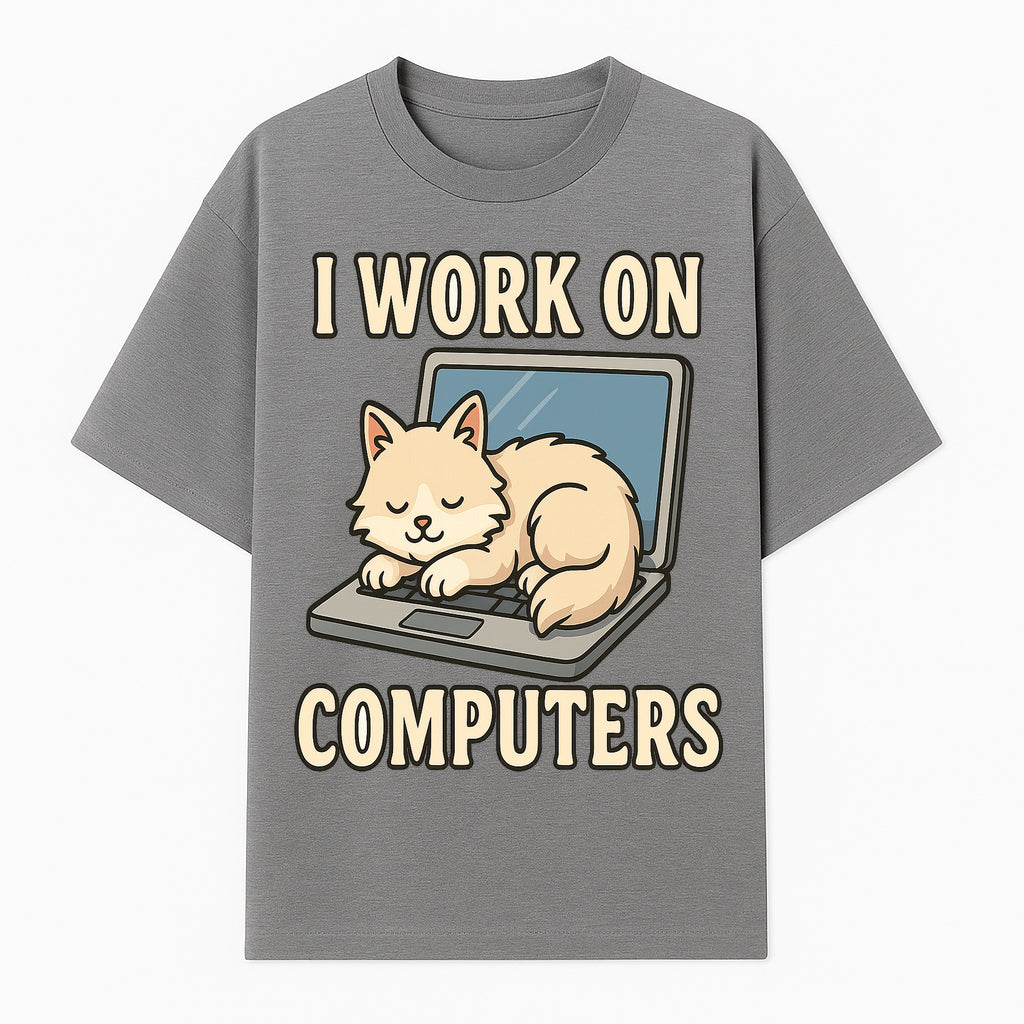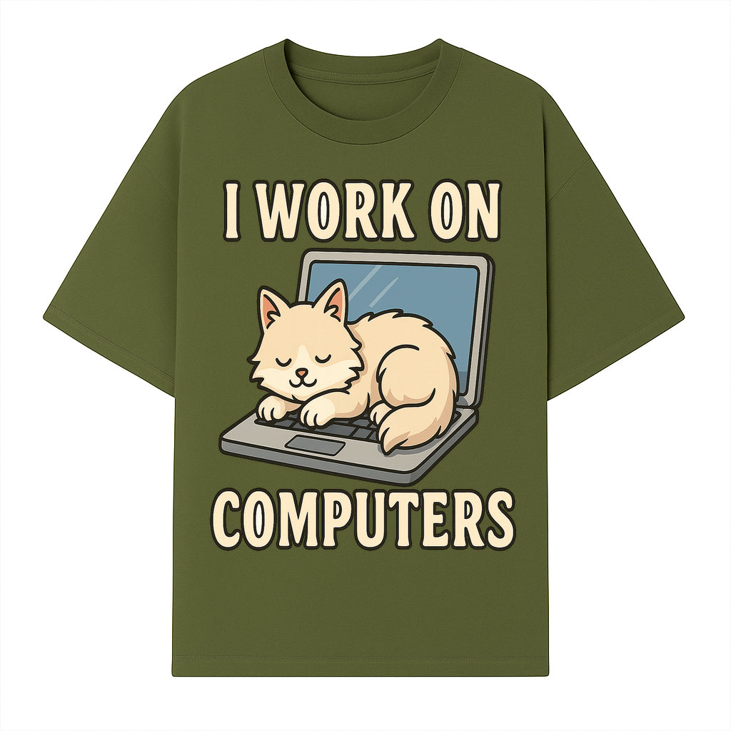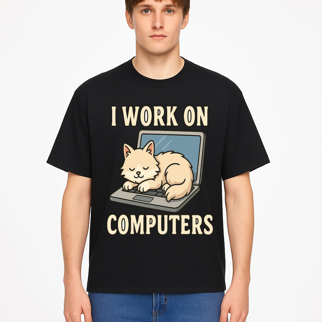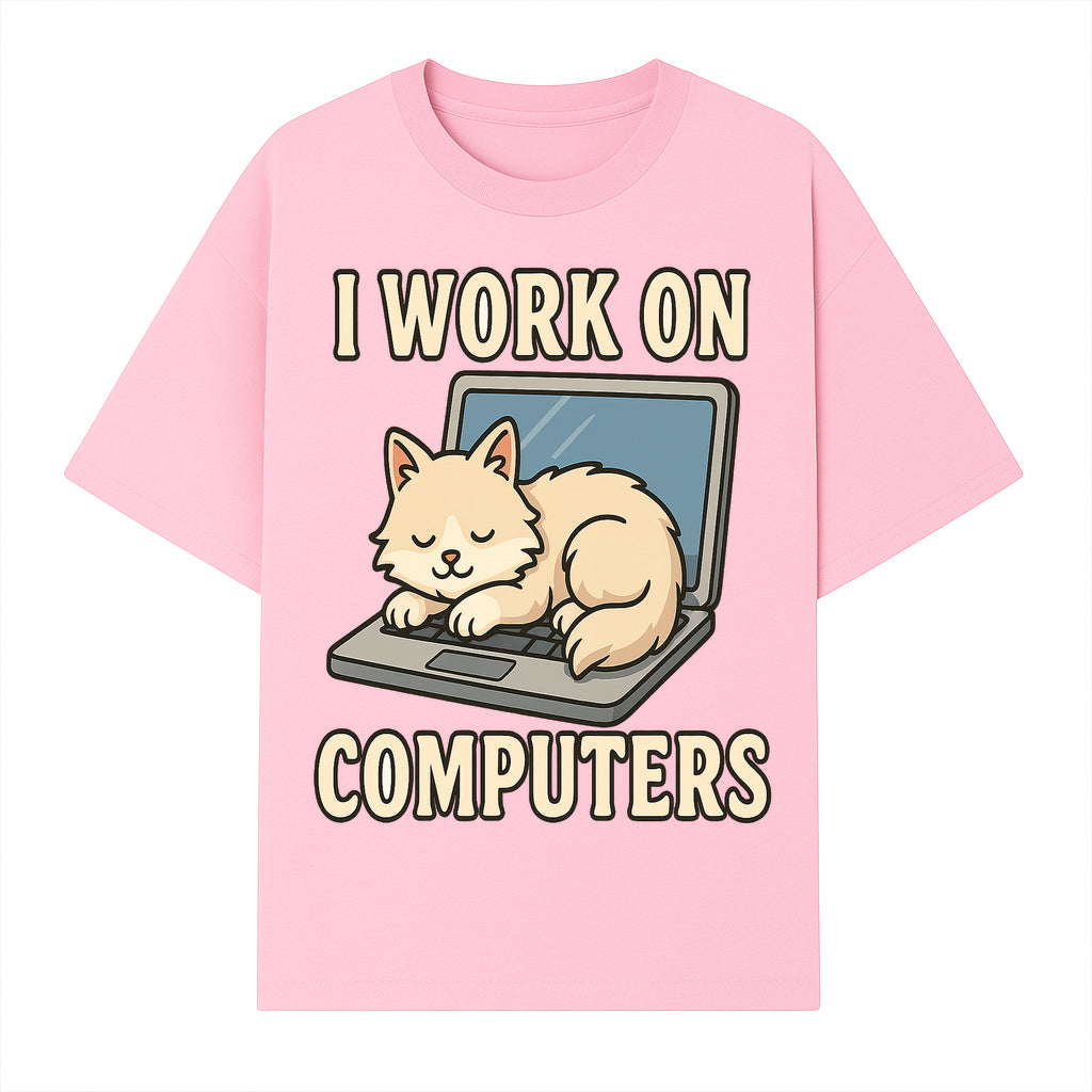 Funny Cat Gift - I Work on Computers Laptop Design - Cute Cat Lover's Work from Home T-Shirt or Mug - T-shirt