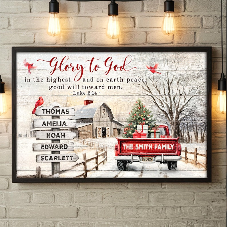 Personalized Family Christmas Canvas Wall Art, Glory To God In The Highest Wall Art 2025, Custom Name Red Truck Print, Family Name Canvas