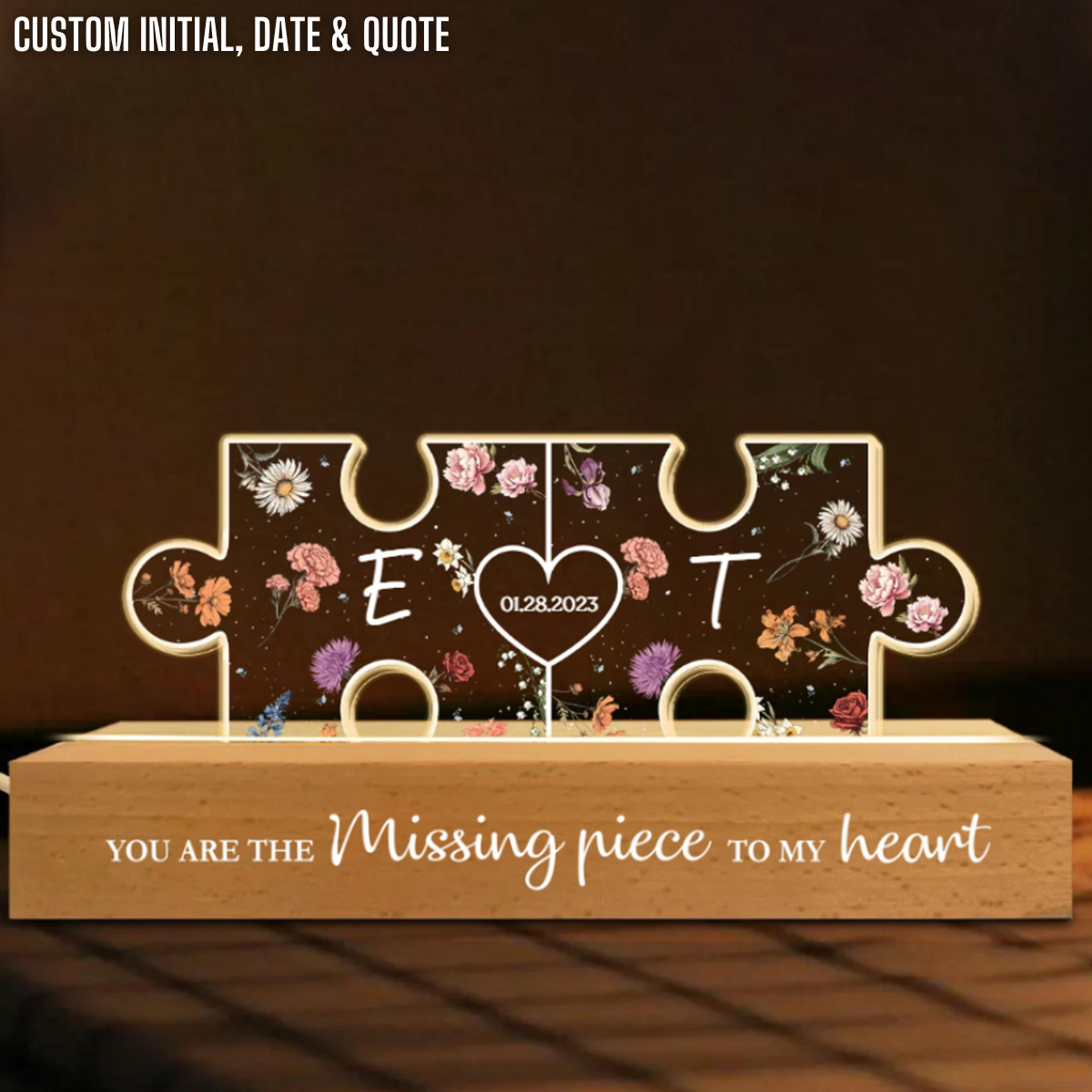 Personalized Couple Initials Puzzle Pieces Floral Theme Valentine's Day Gift, Custom Name and Date Night Light Led Gifts For Him/Her