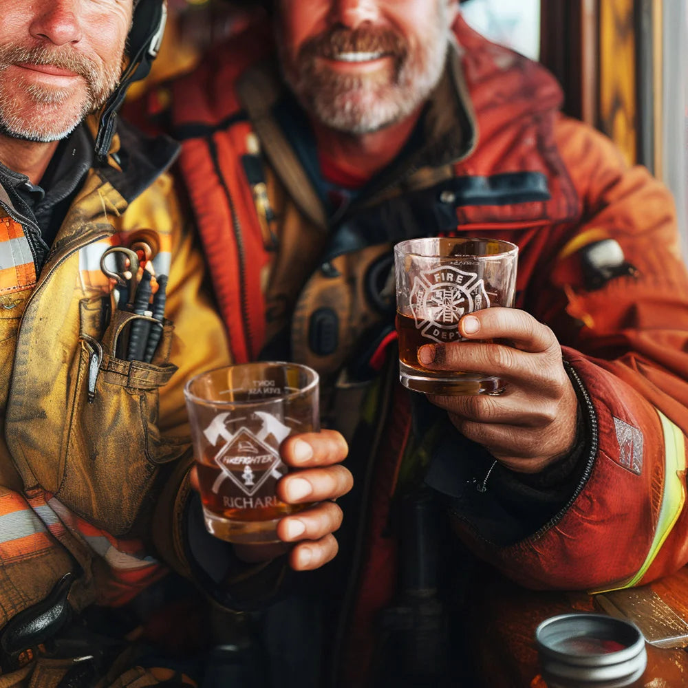 Personalised Firefighter Badge Etched Whisky Glass with Text Birthday Retirement Gift for Firefighter