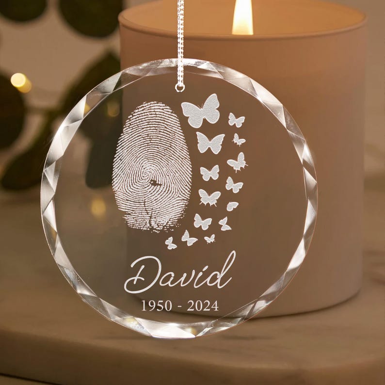 Honor the memory of your loved one with our Custom Fingerprint Butterfly Memorial Ornament. This beautiful ornament is not only a touching remembrance gift, but also a unique and personalized way to keep your loved one close. With the option to include their fingerprint, this ornament will be a cherished reminder of their life and legacy. Perfect for those who have lost a loved one, it is a thoughtful and heartfelt way to show your sympathy and support.