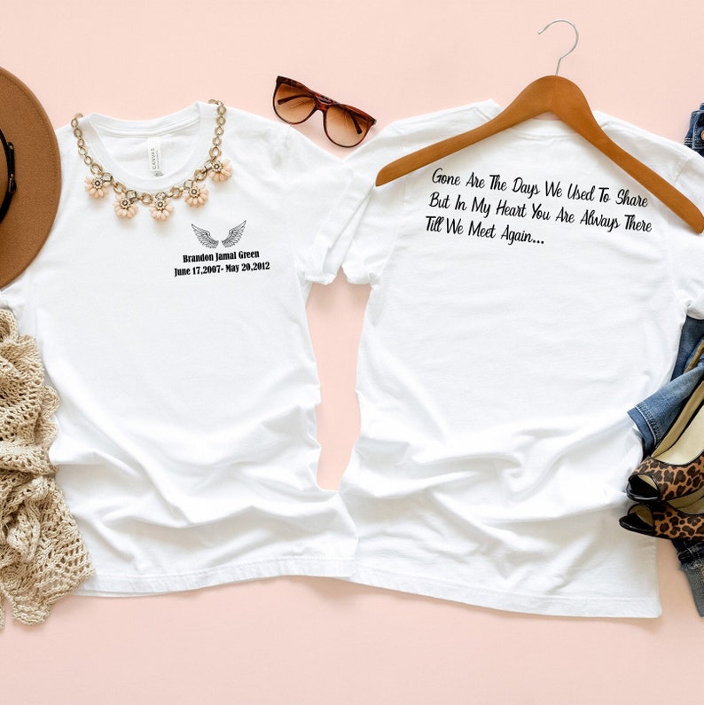 Honor your loved one with this beautifully personalized memorial t-shirt. Featuring your custom photo(s), name, and dates – this shirt is a heartfelt tribute that brings comfort and remembrance wherever you go.